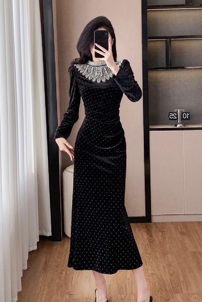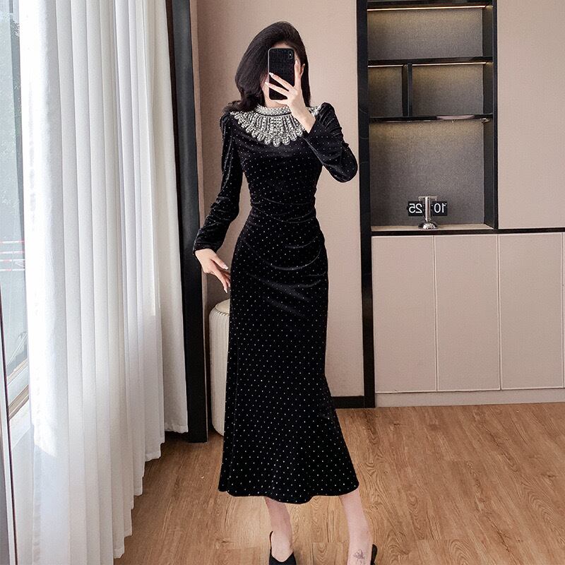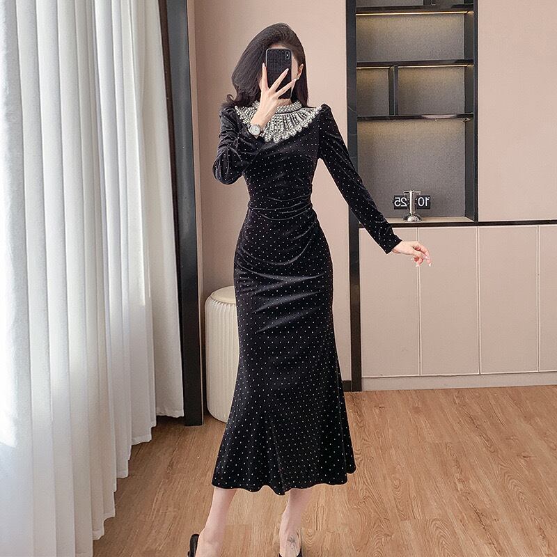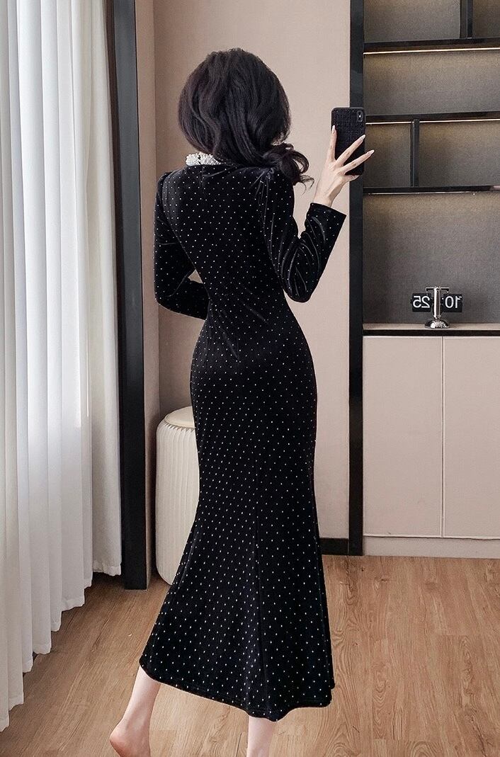 【dress】ベルベットドット柄マーメイドワンピース IR11259