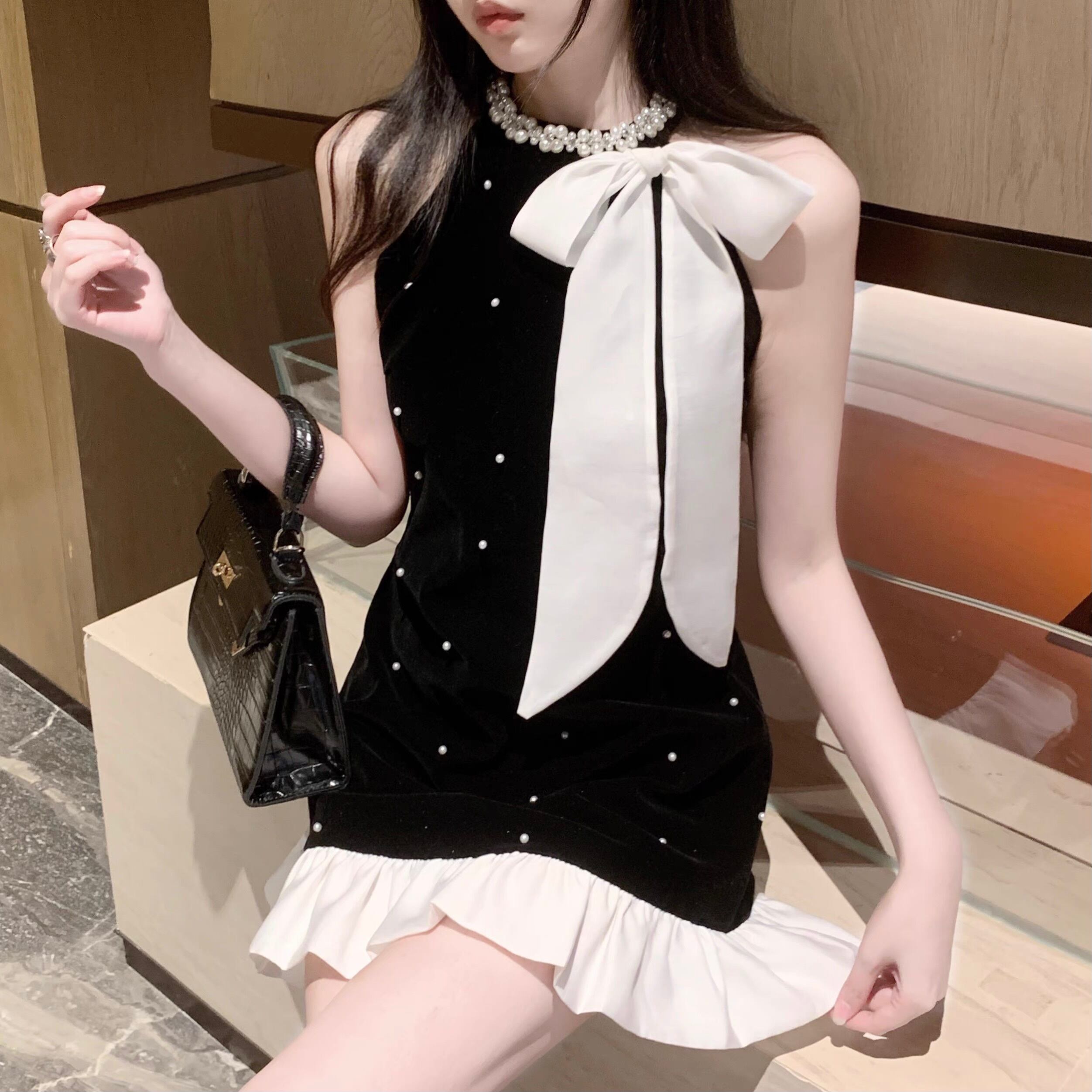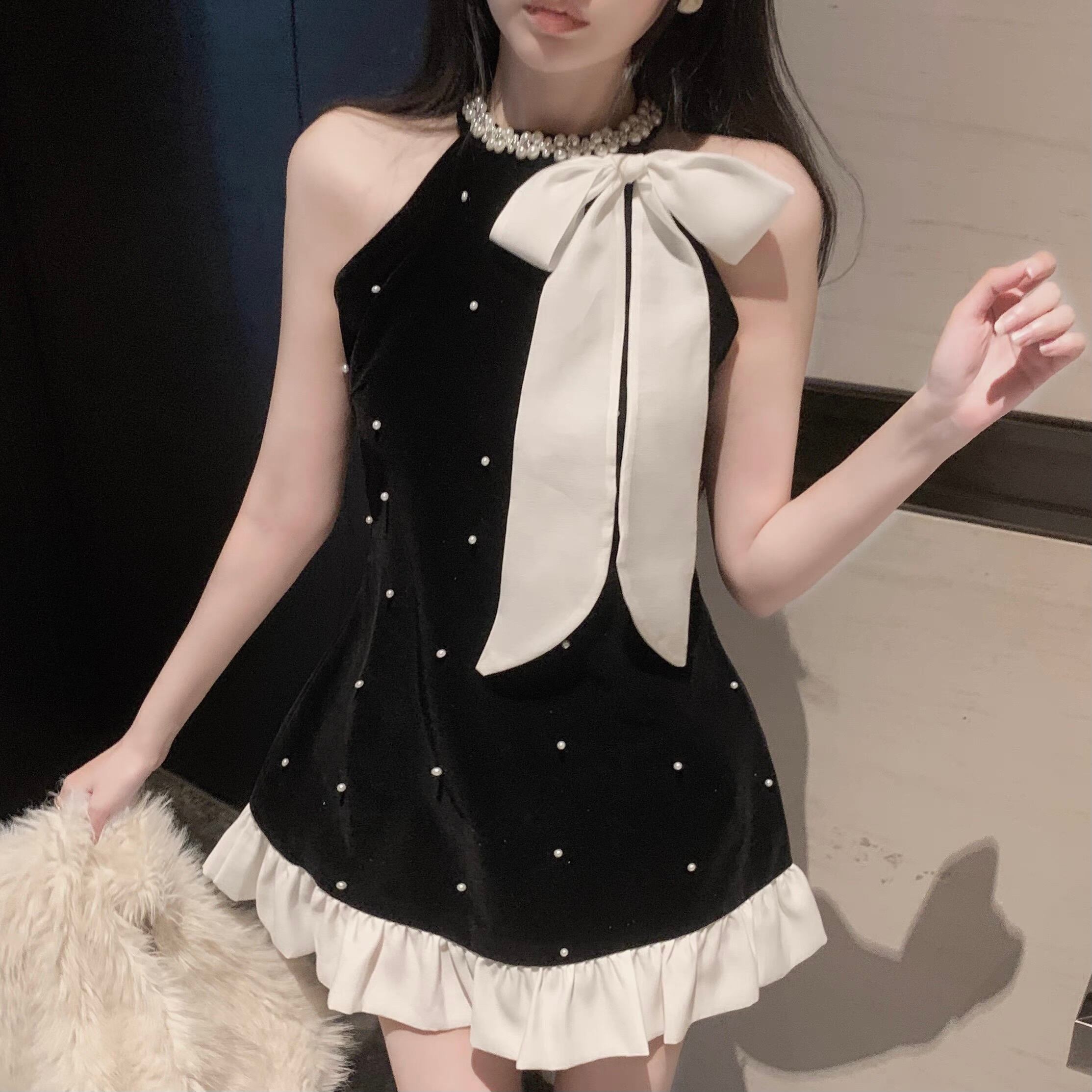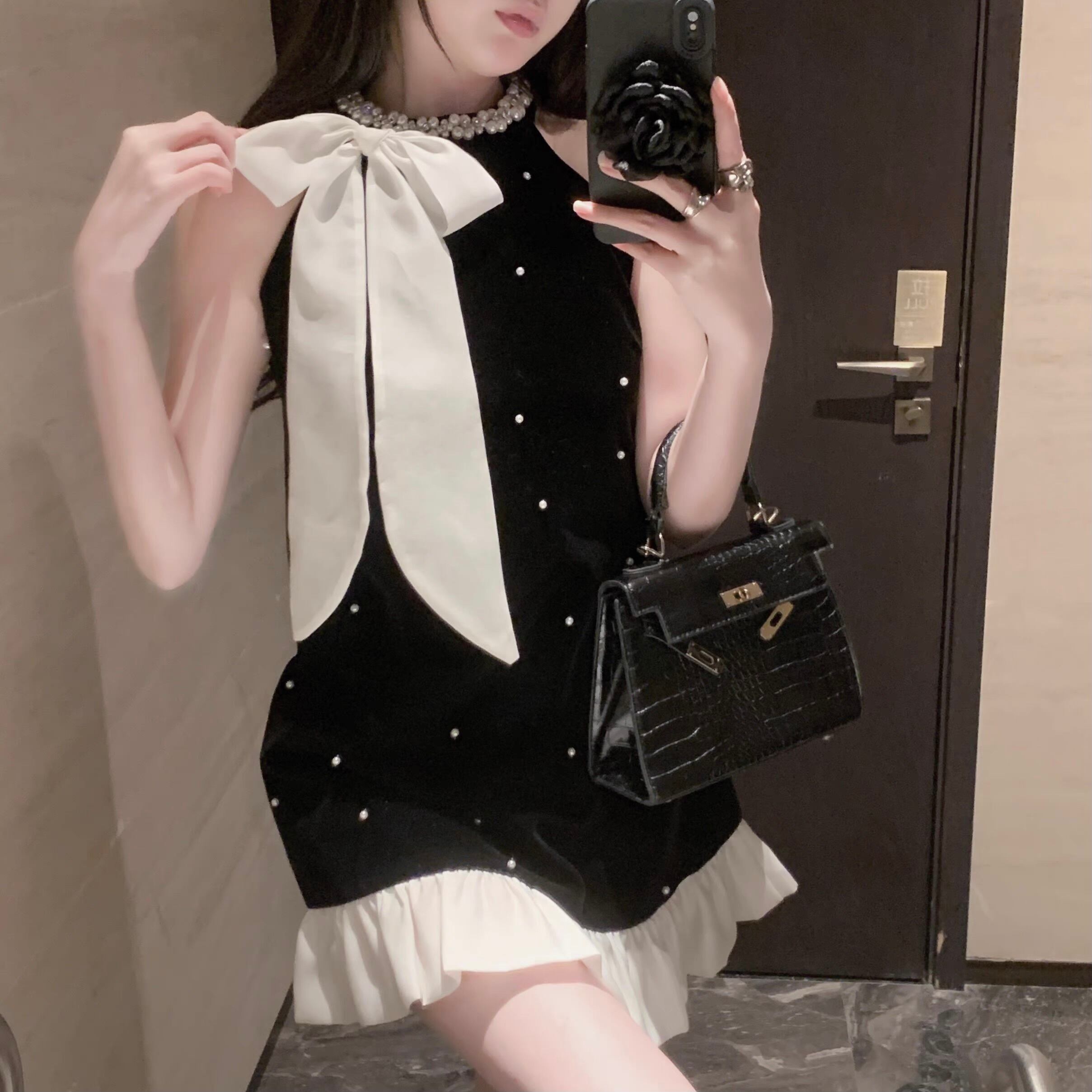 【dress】パールリボンフリルベロアノースリーブワンピース FQ0049