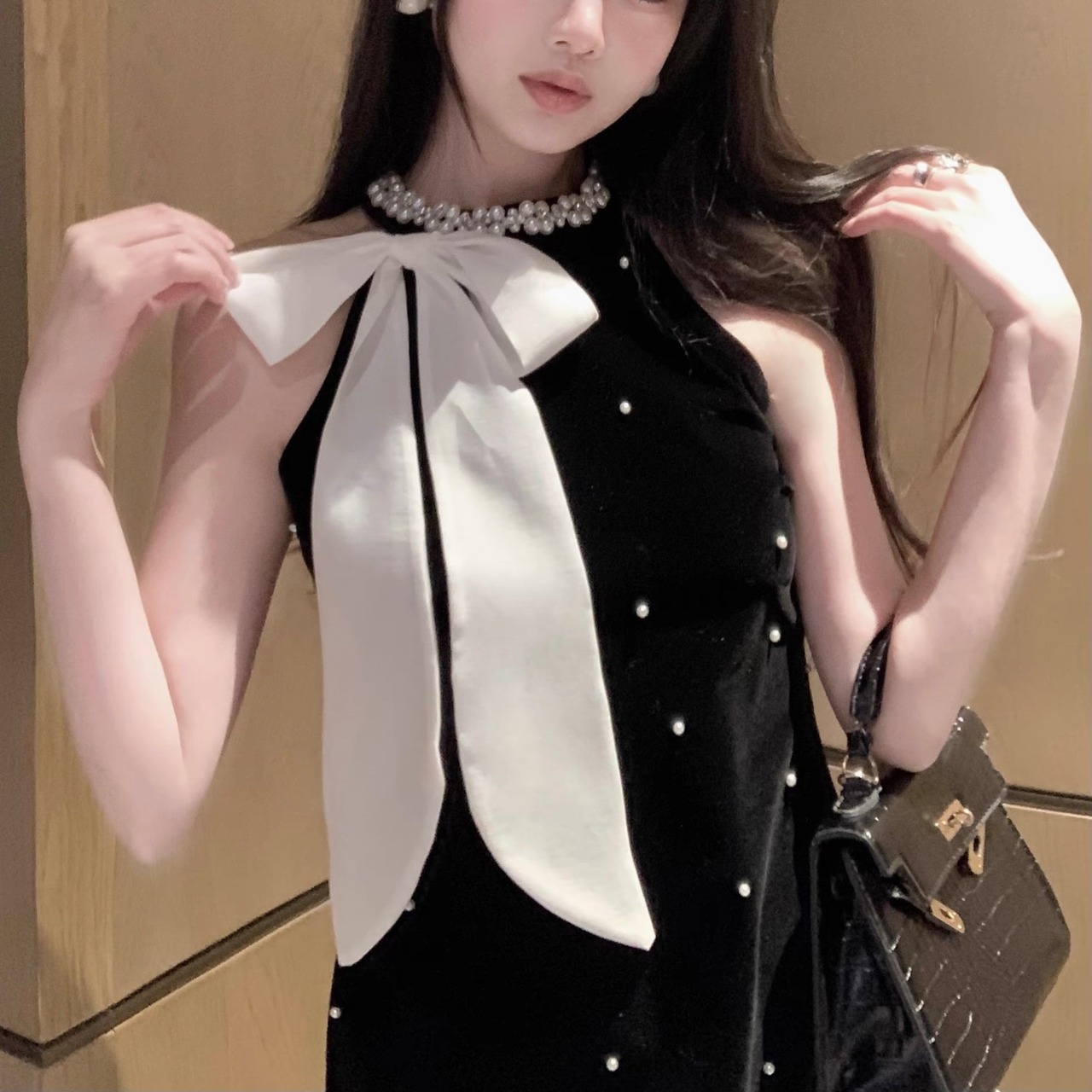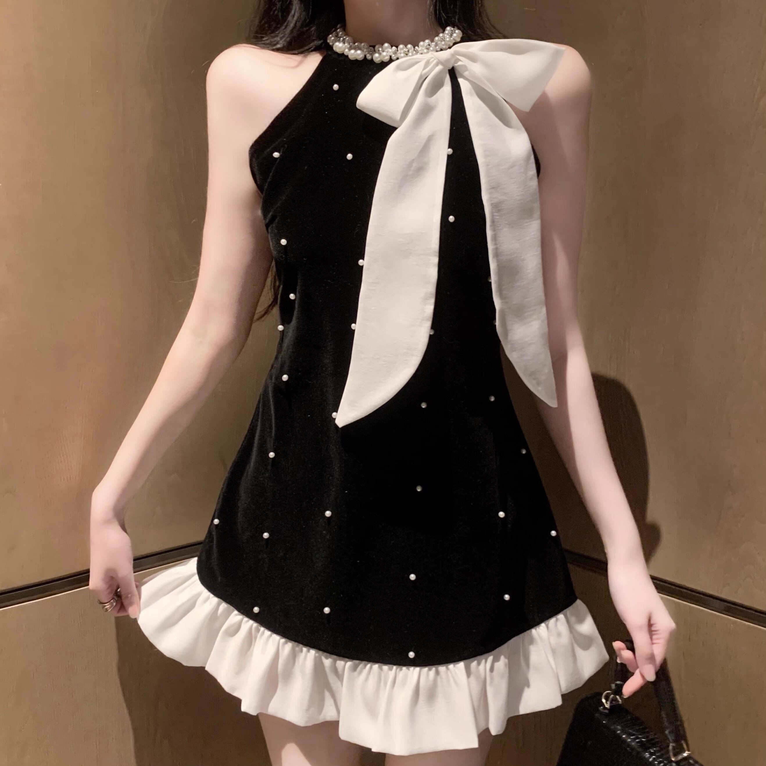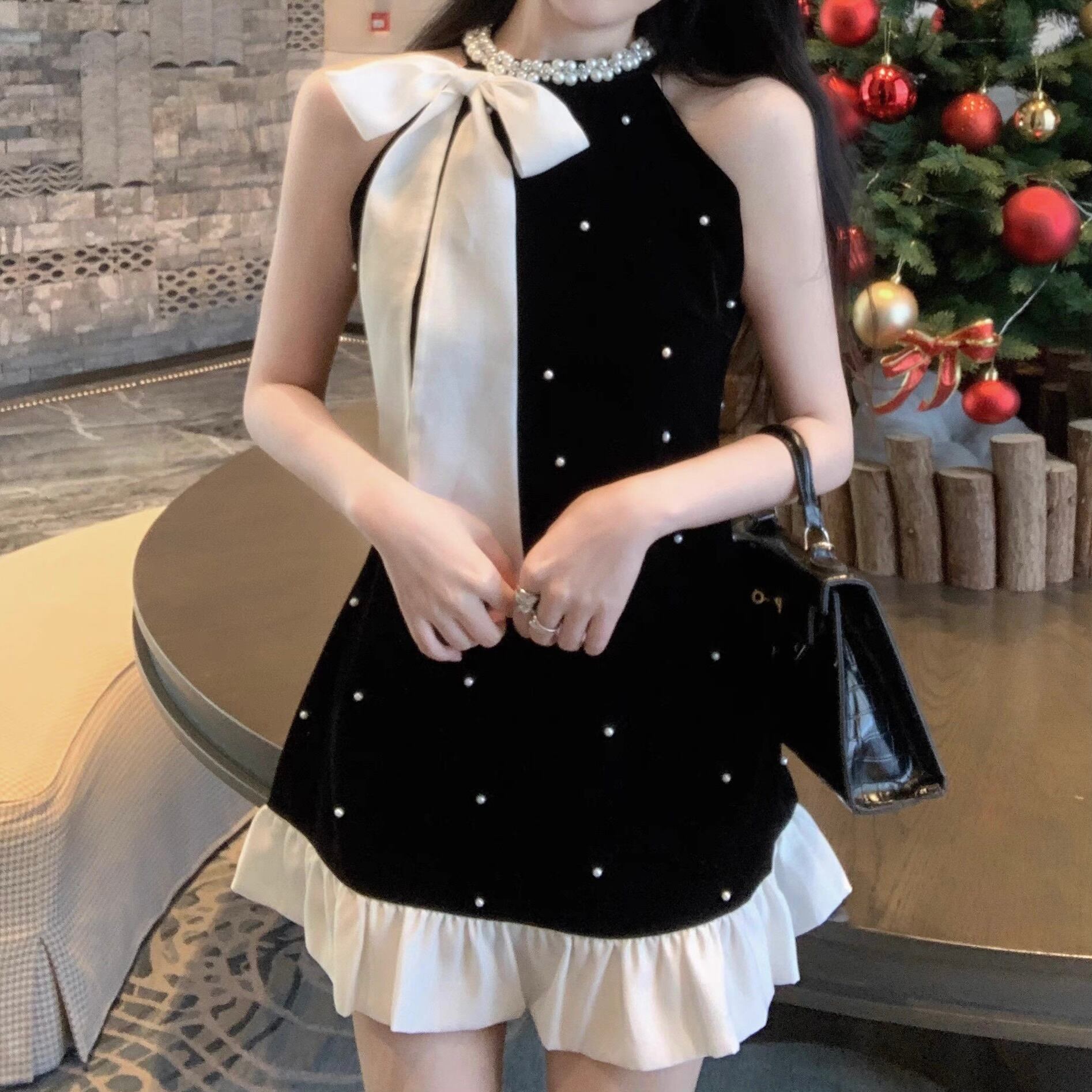 【dress】パールリボンフリルベロアノースリーブワンピース FQ0049