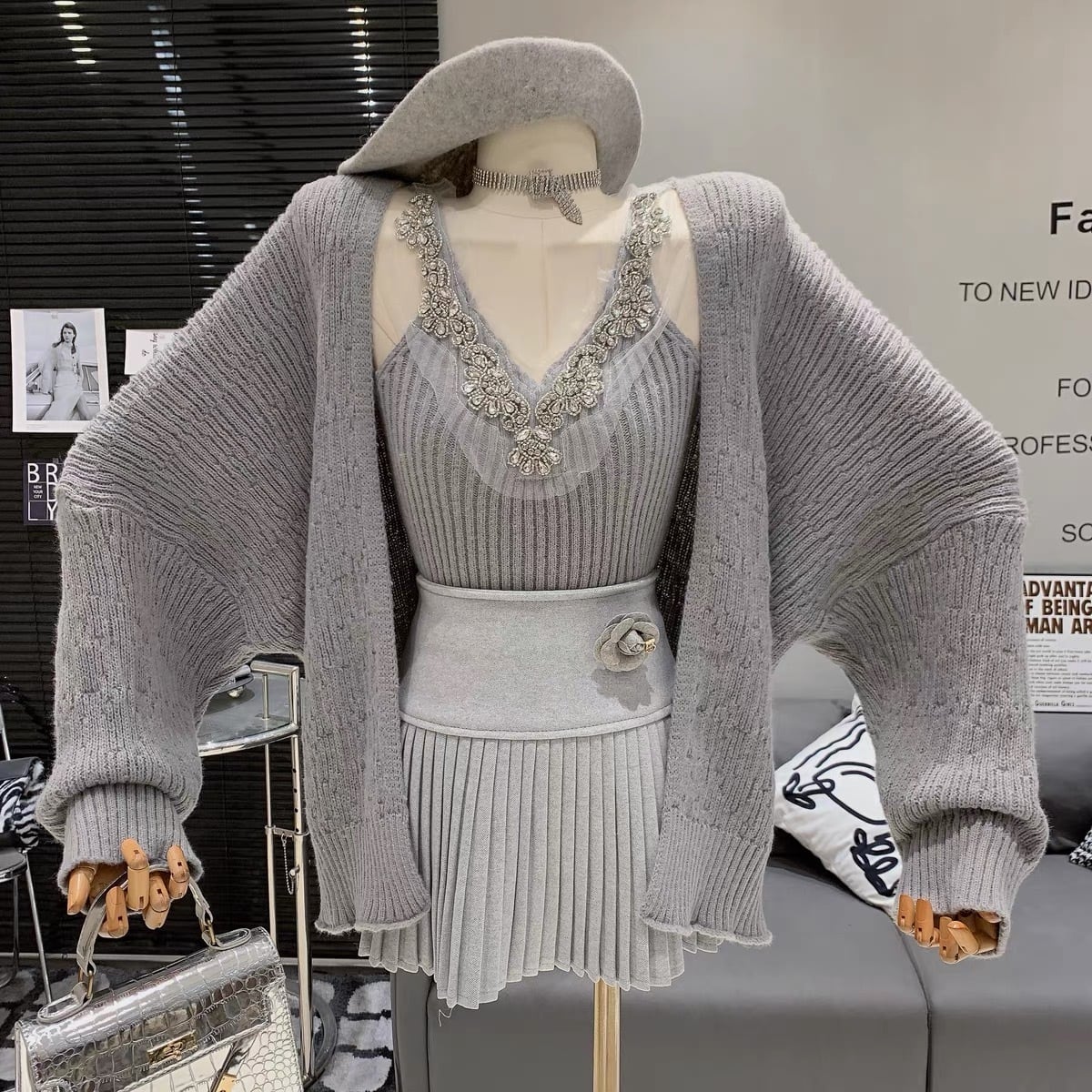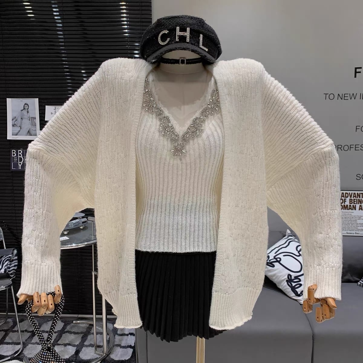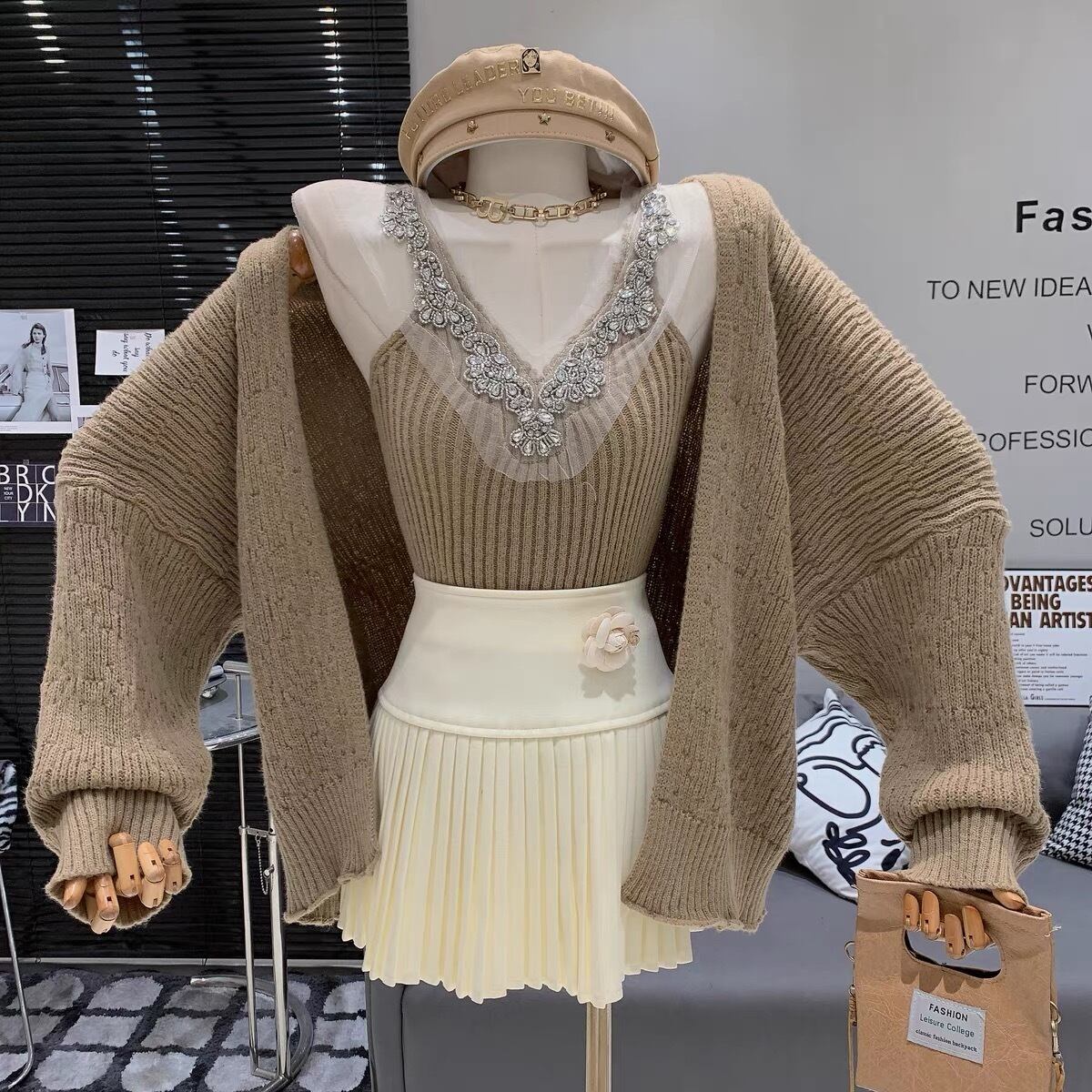 【set】ビジュー付きVネックキャミトップスxカーディガン4色 SY12021