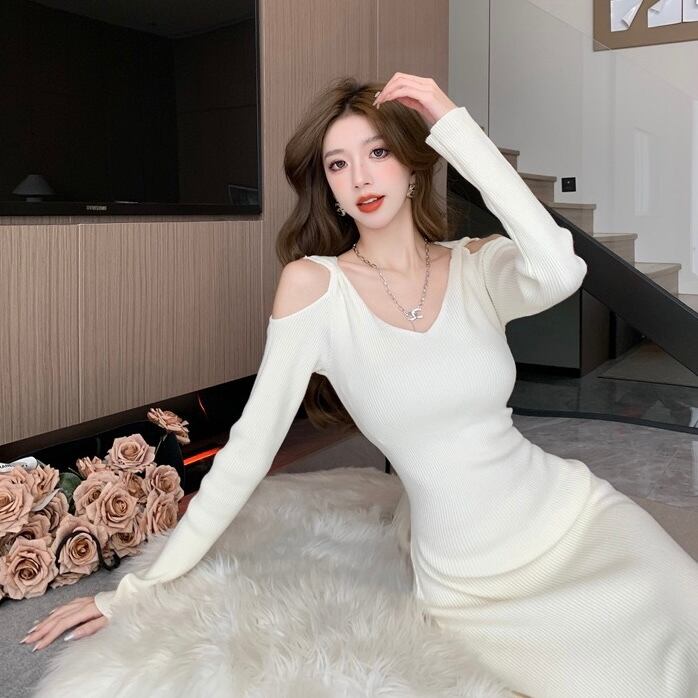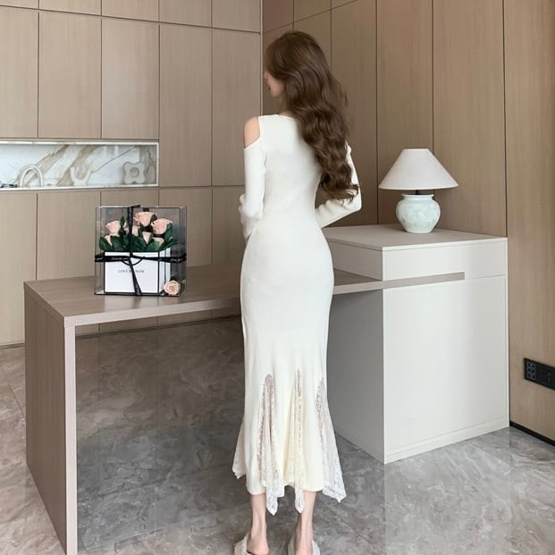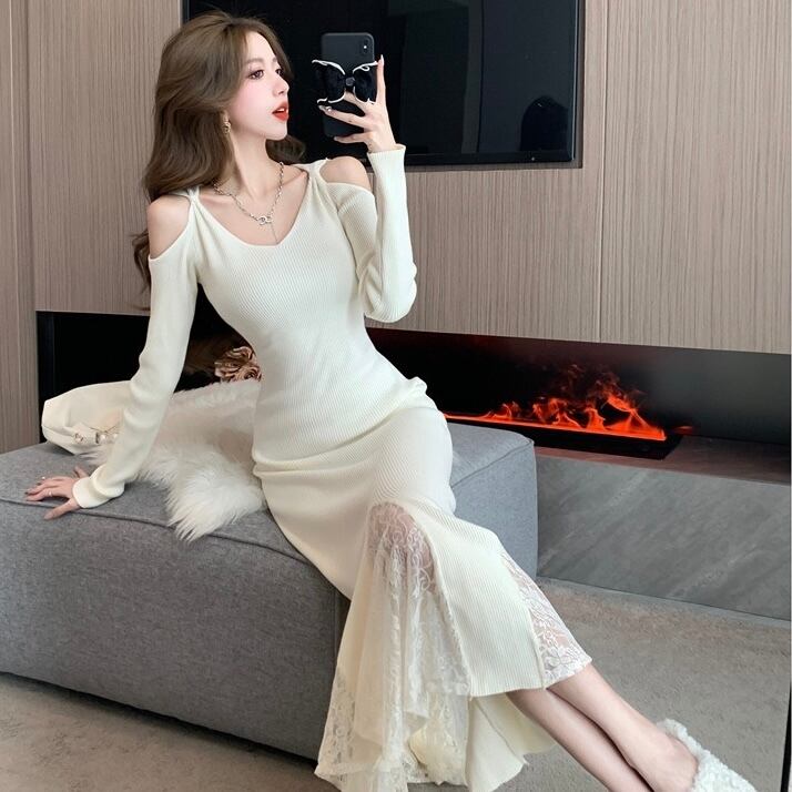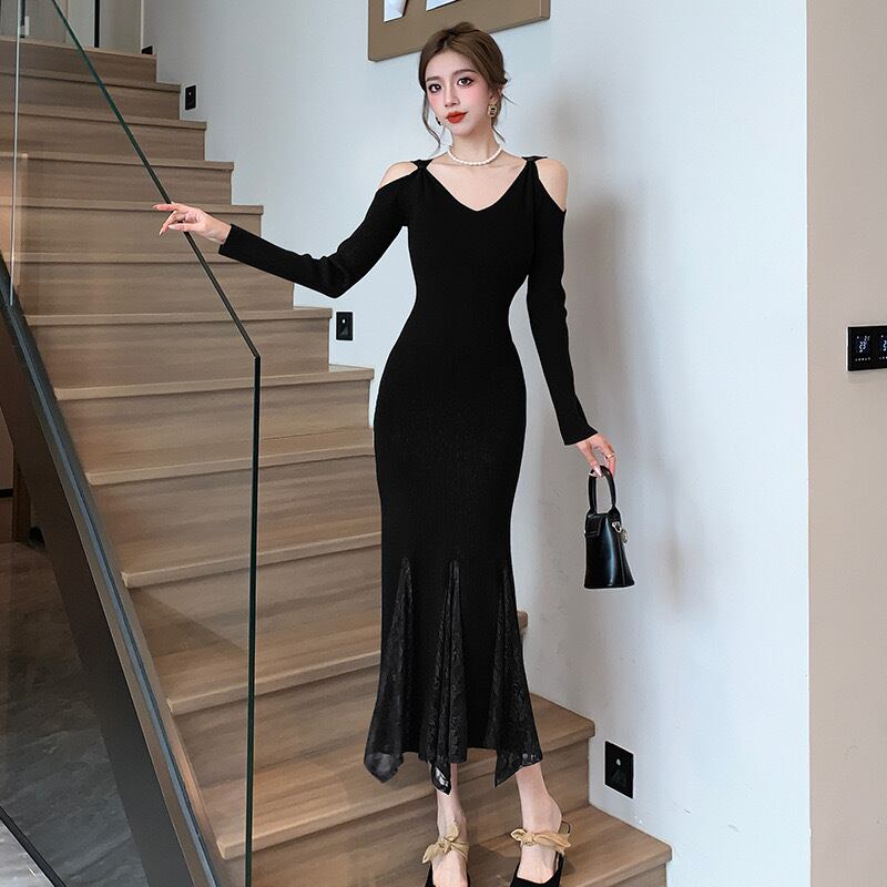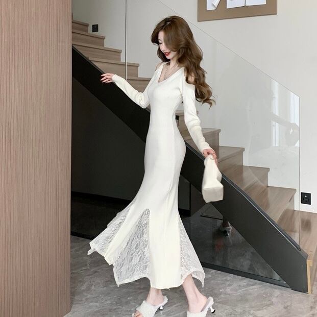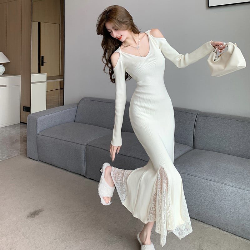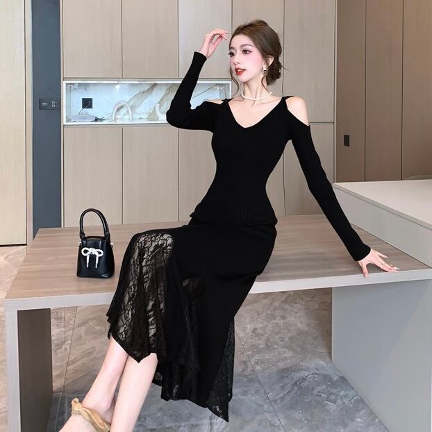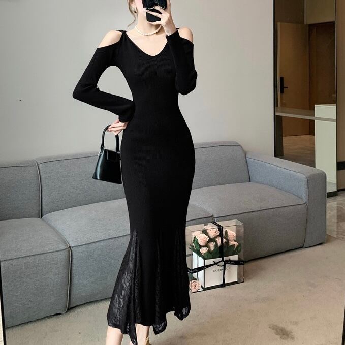 【dress】レースドッキングマーメイドニットワンピース2色 SY12049