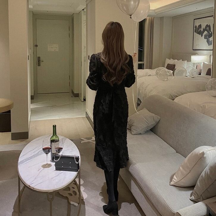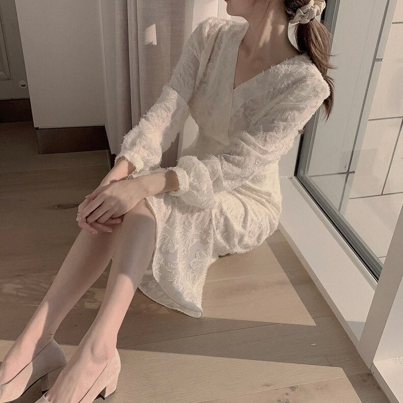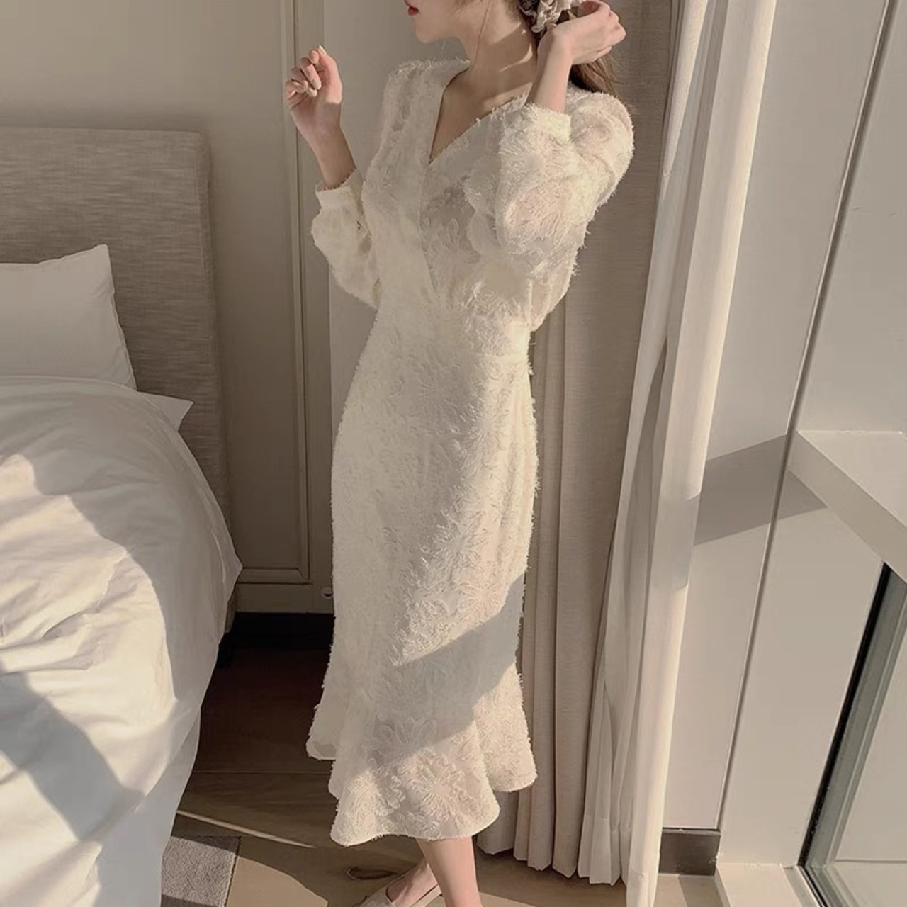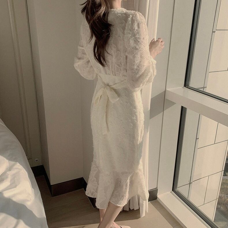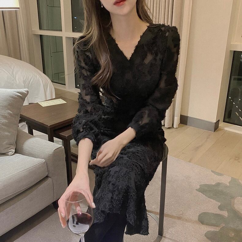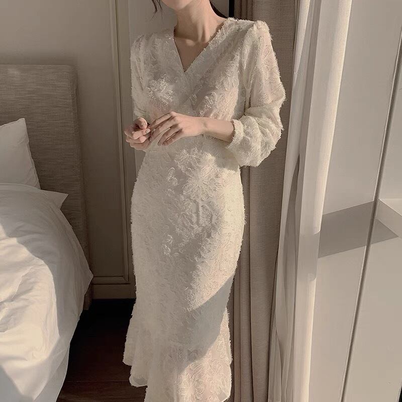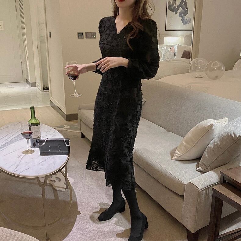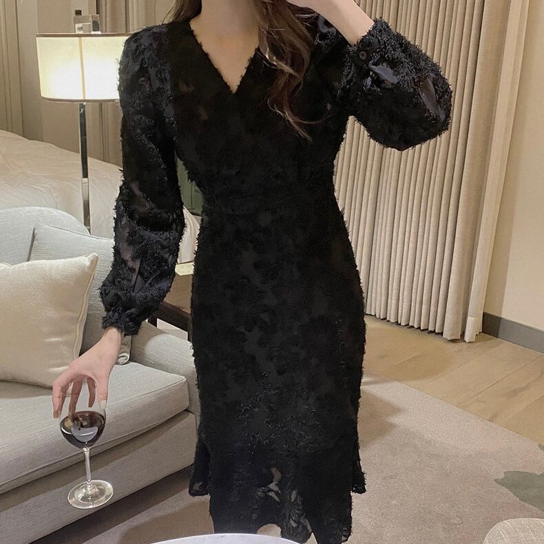 【dress】Vネック刺繍マーメイド長袖ワンピース2色 HB12060