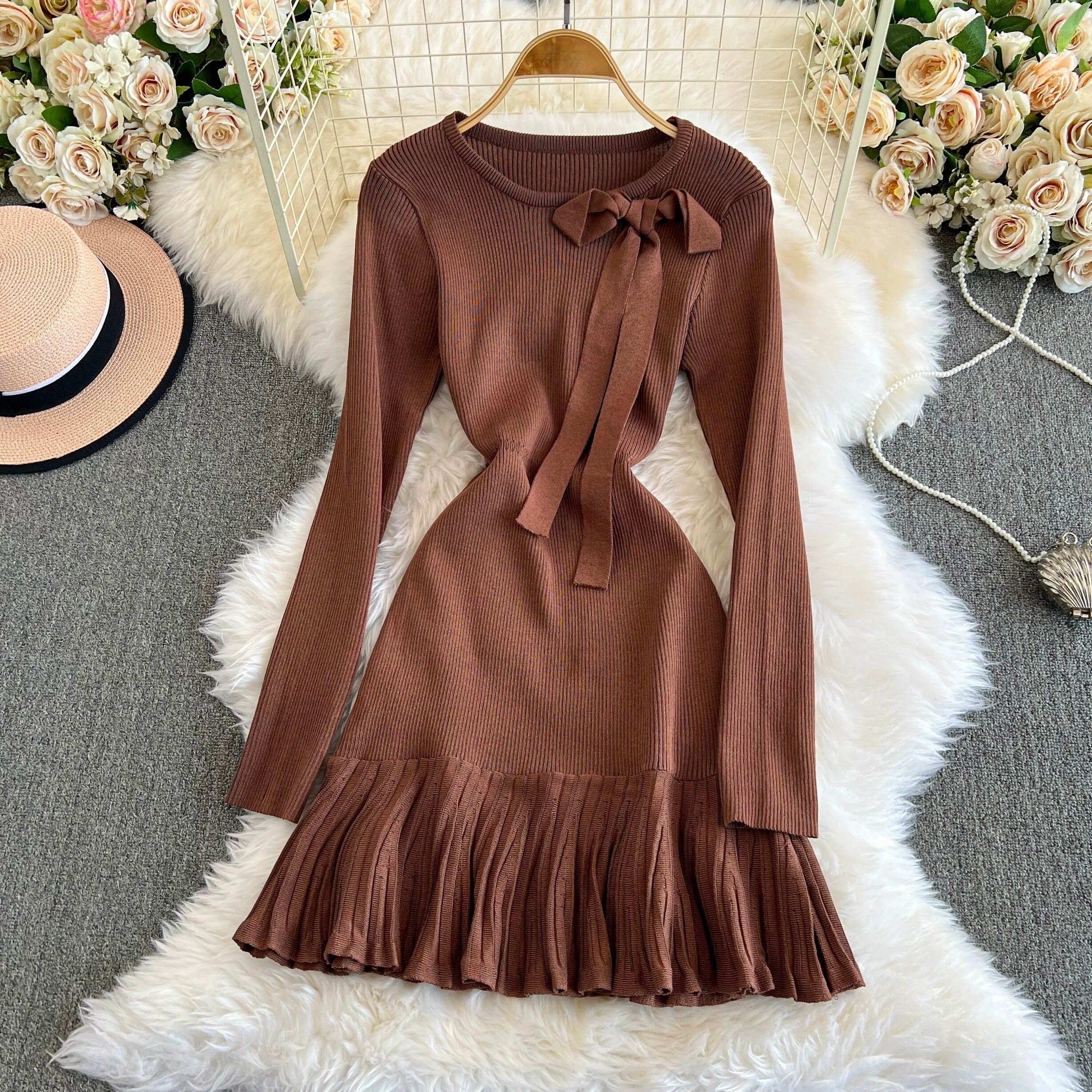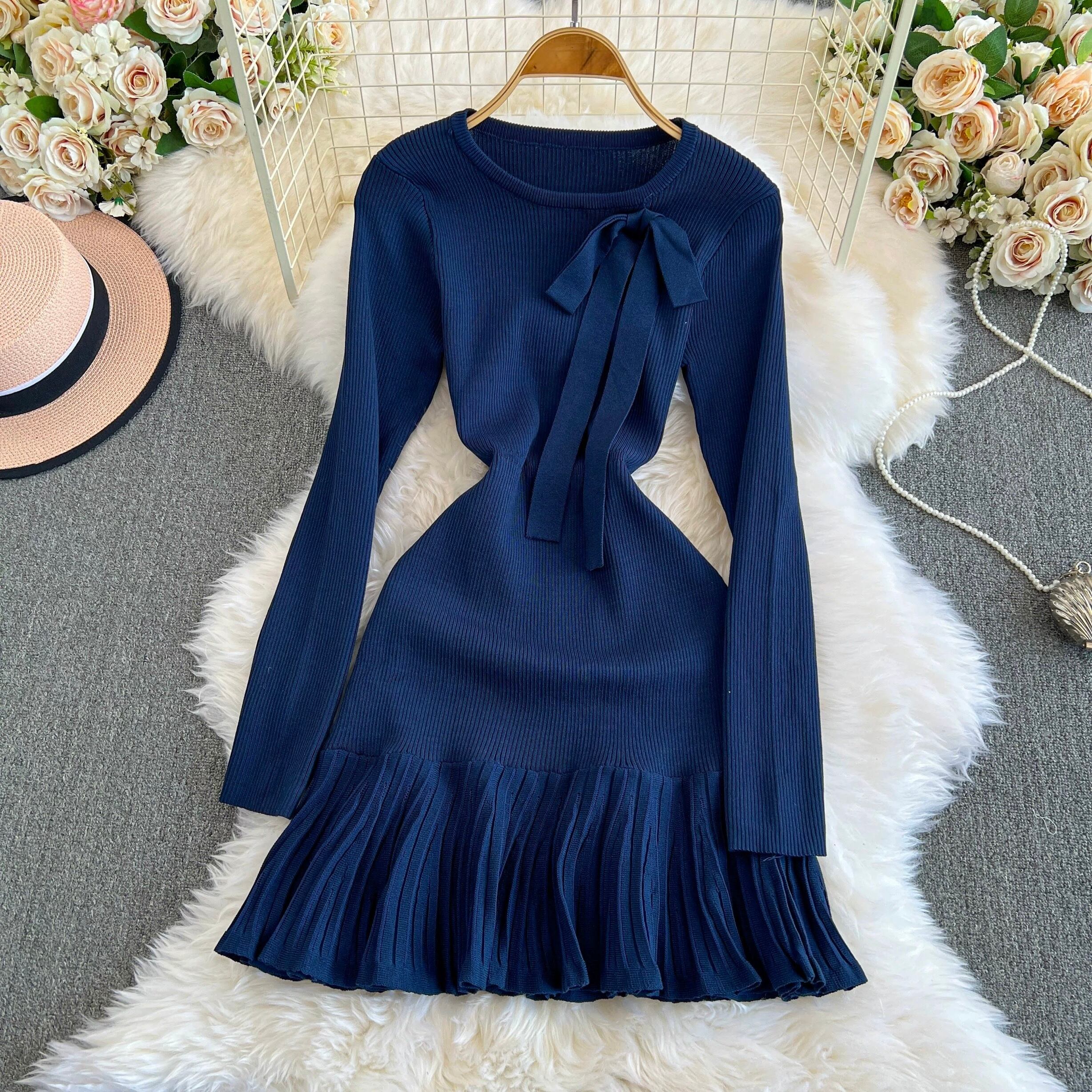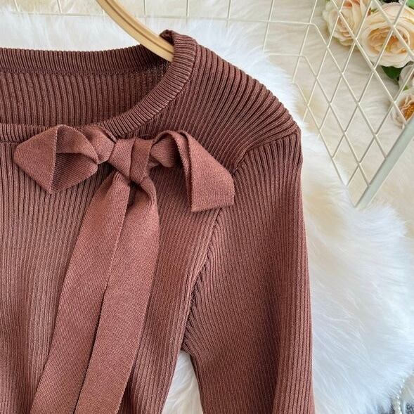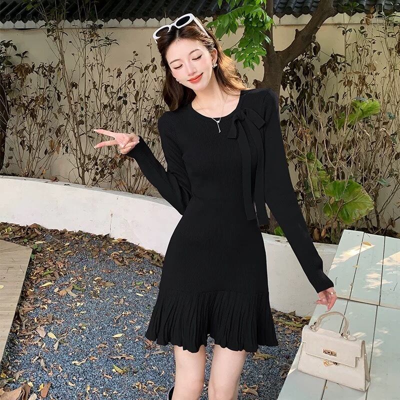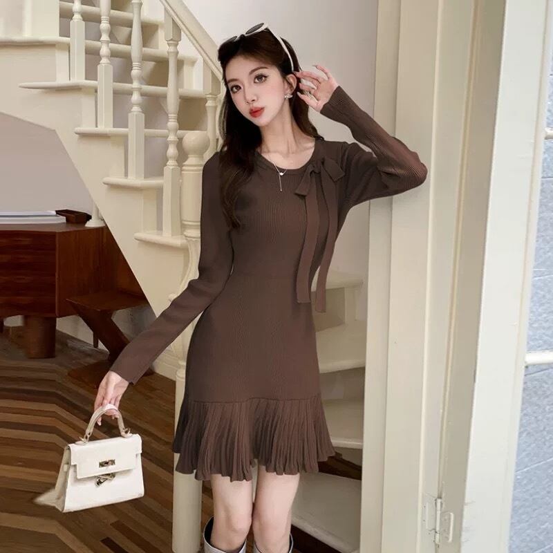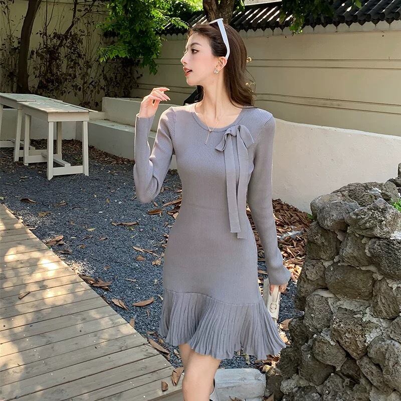【dress】リボン長袖ニットワンピース4色 OR0054