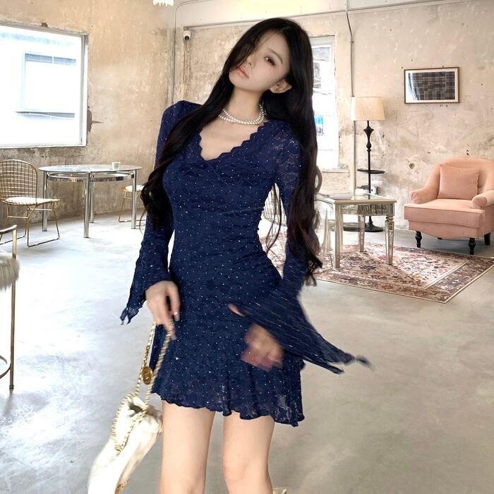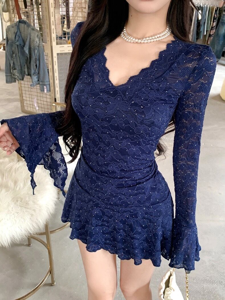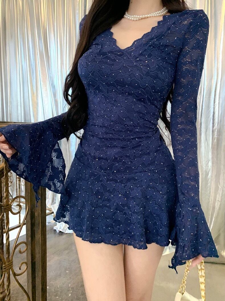 【dress】Vネックレース長袖ミニワンピース OR0096