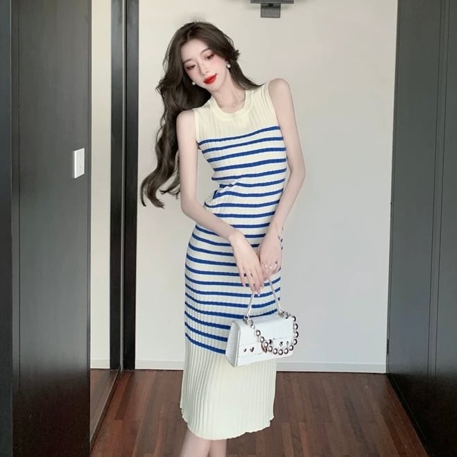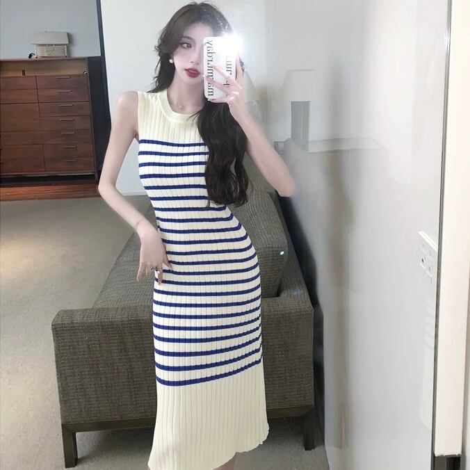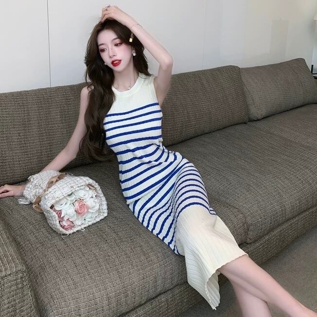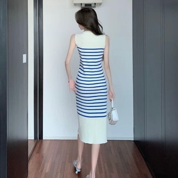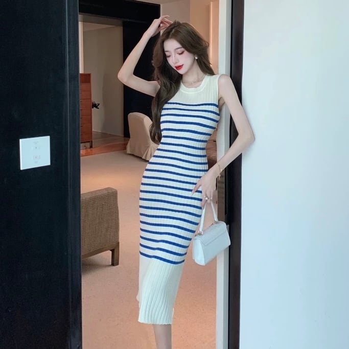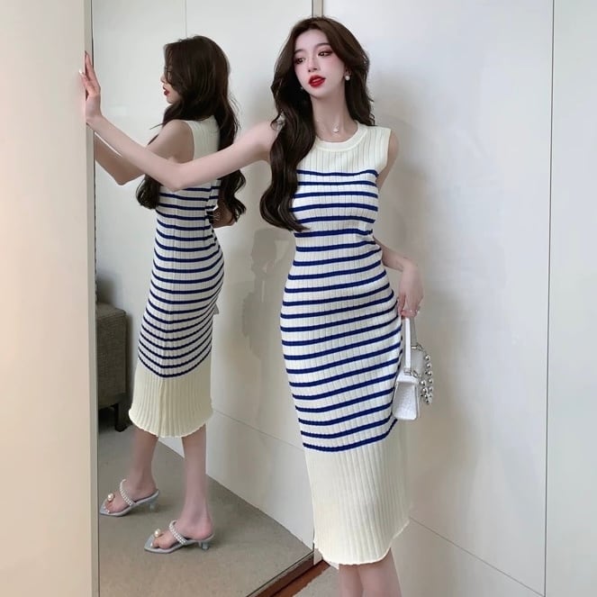 【dress】ボーダー配色ニットノースリーブワンピース OR0116