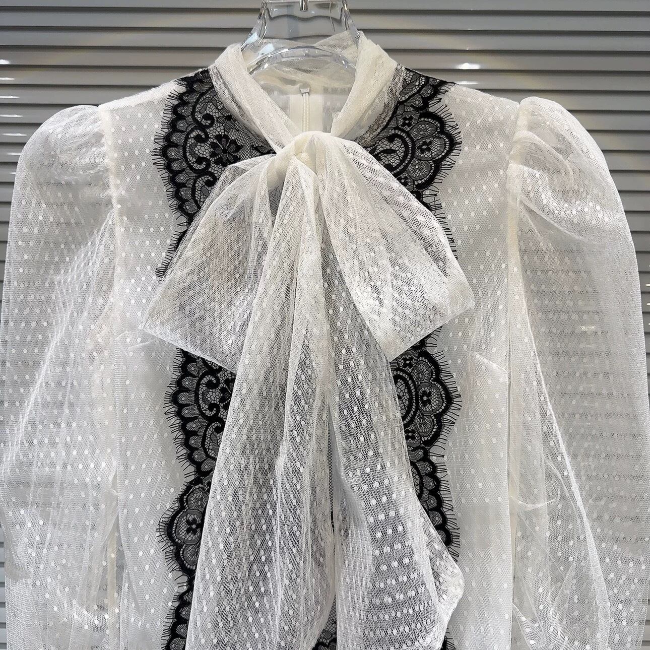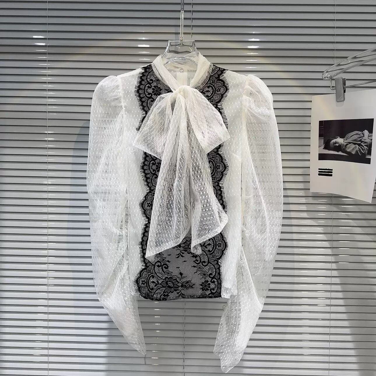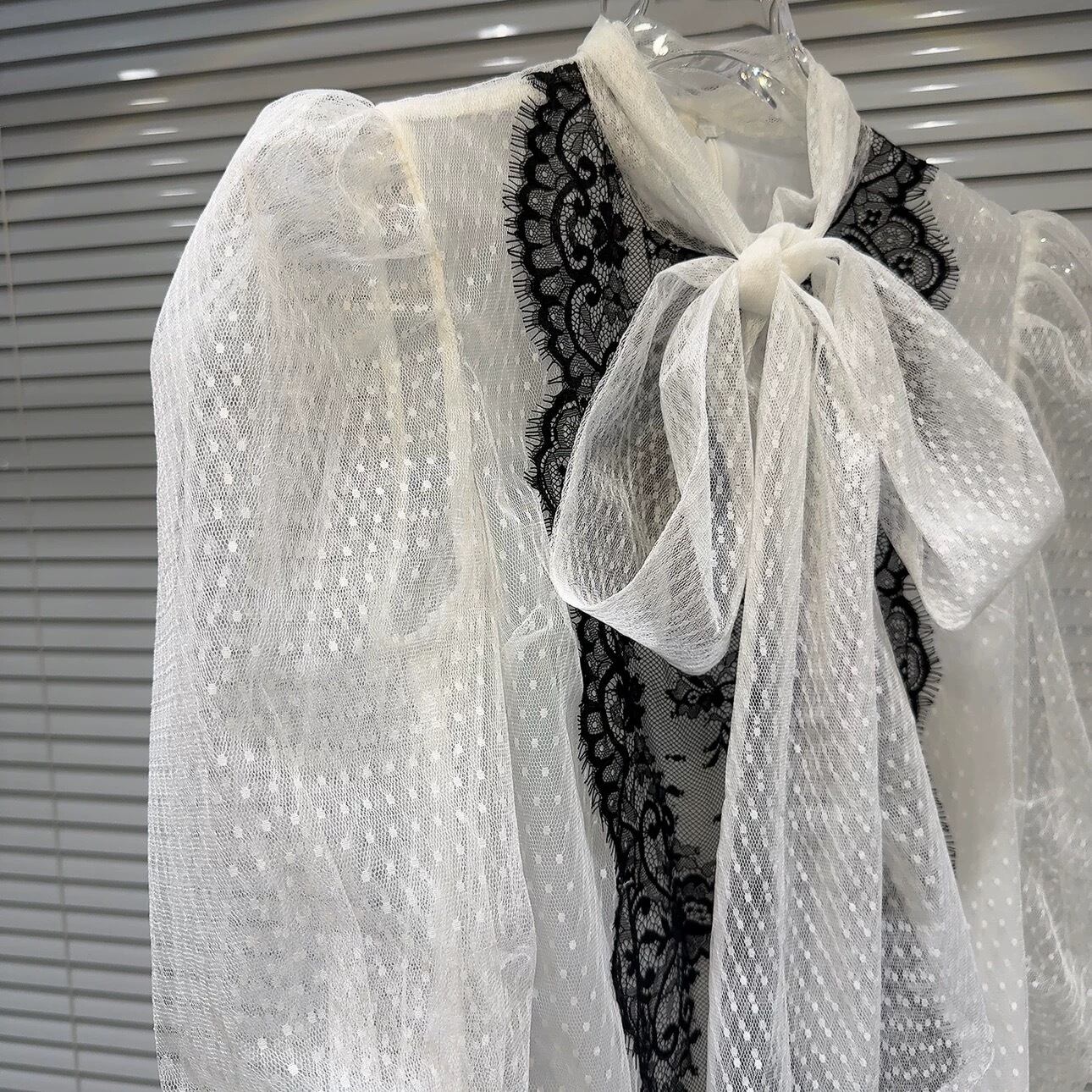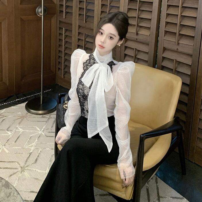 【tops】ボウタイドット柄レースシャツブラウス OR0117