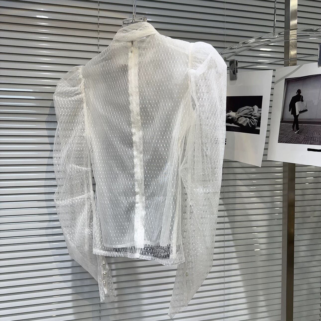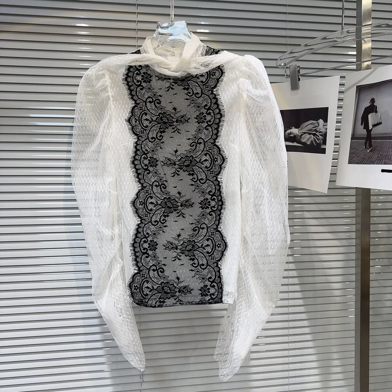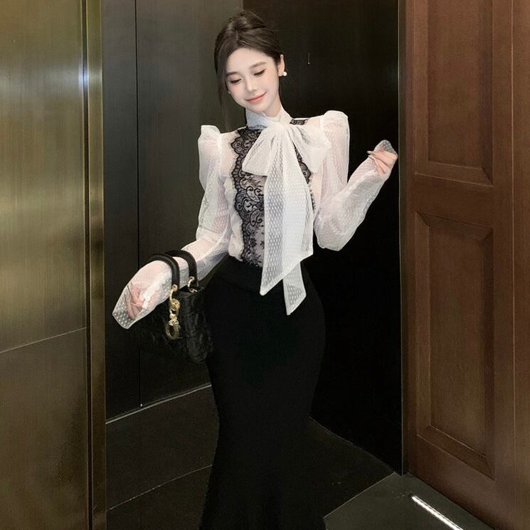 【tops】ボウタイドット柄レースシャツブラウス OR0117
