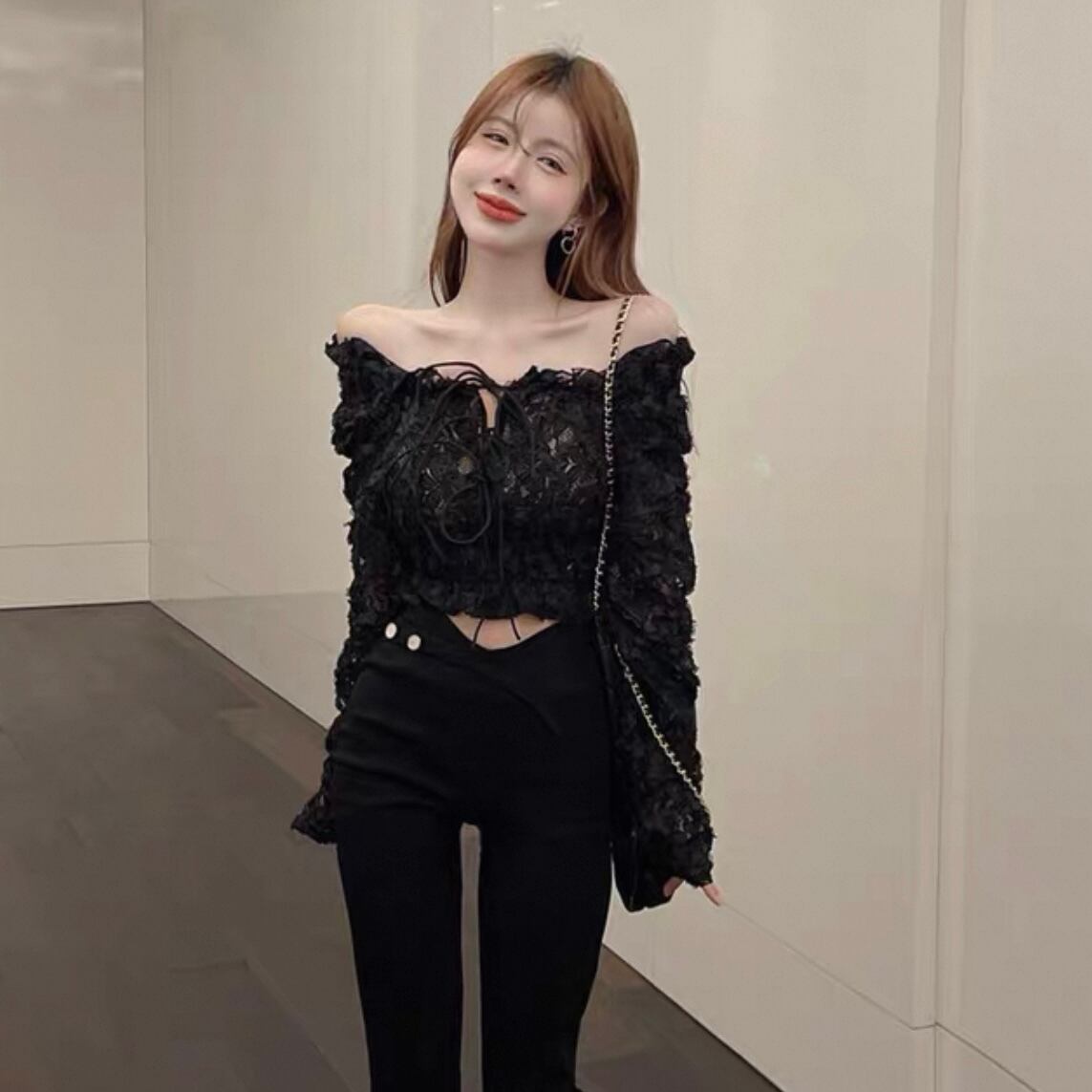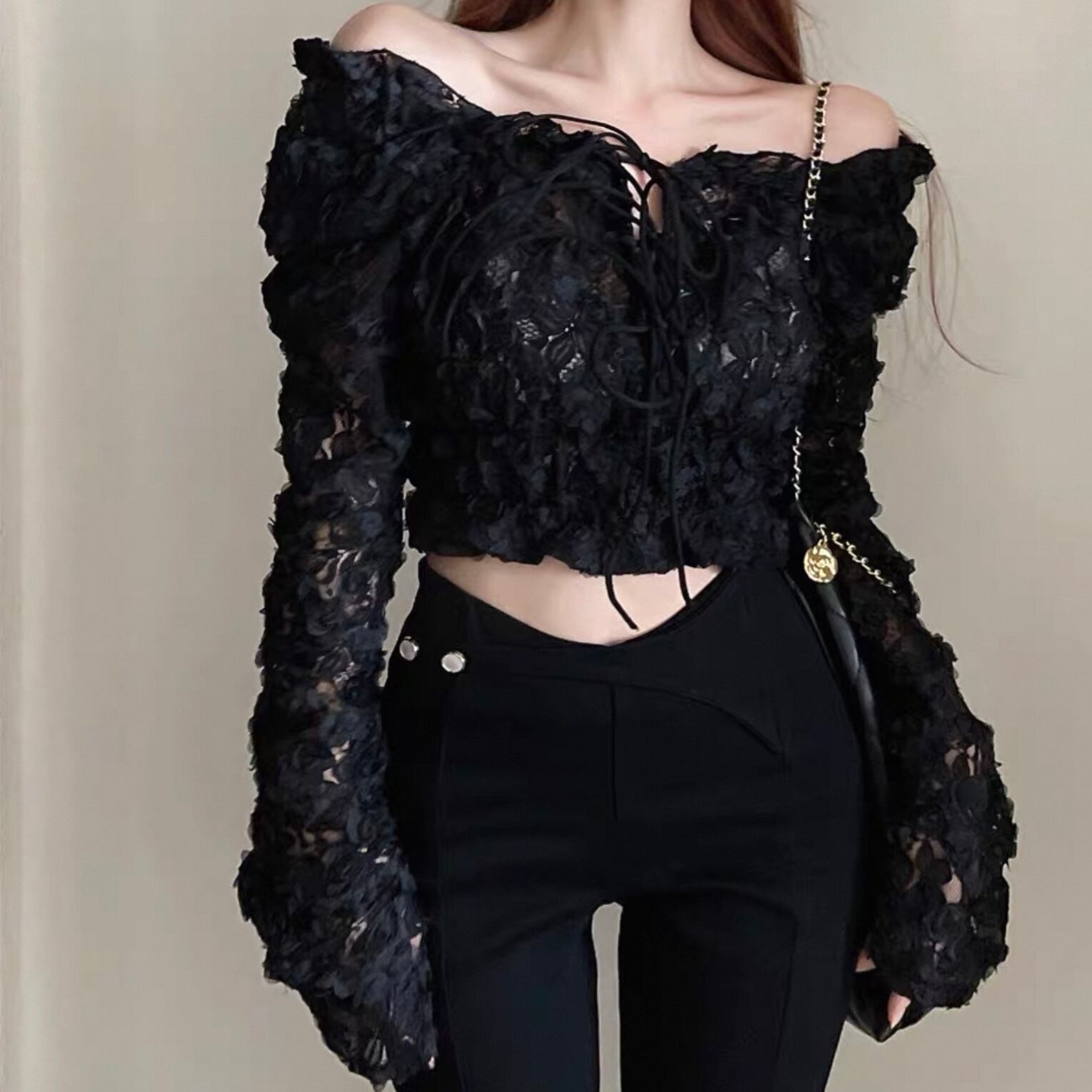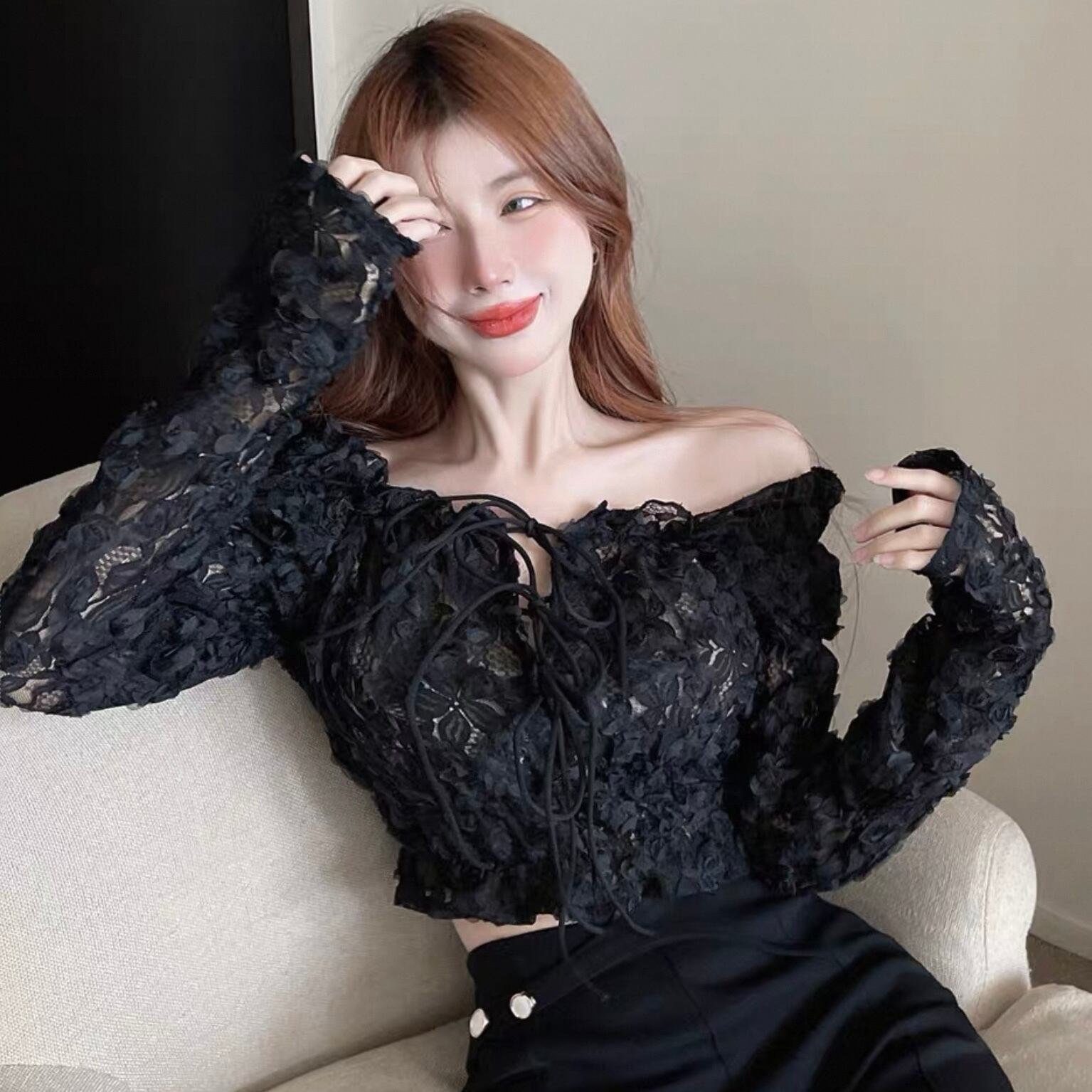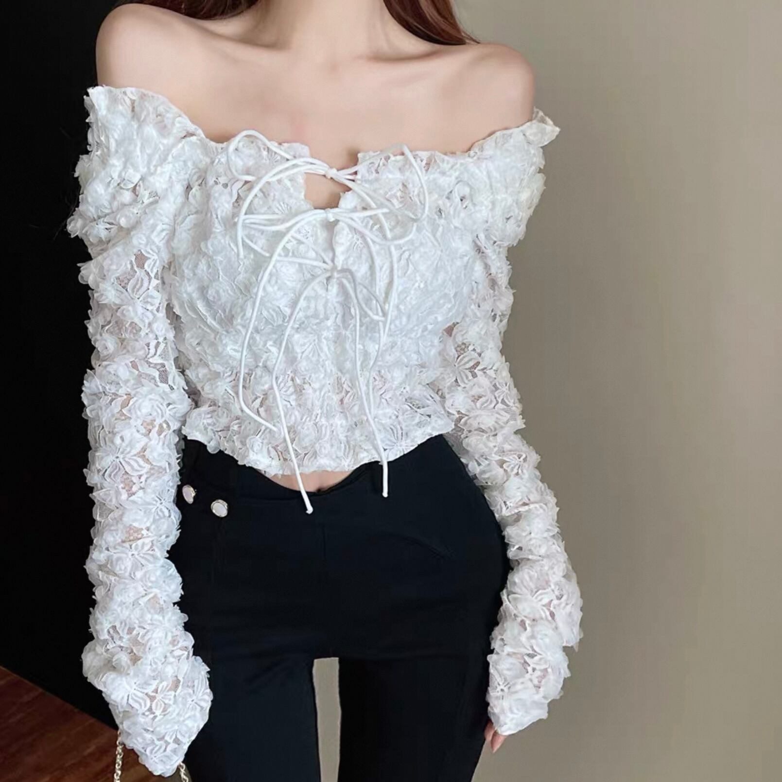 【tops】オフショルダー長袖シースルートップス2色 KQ0329