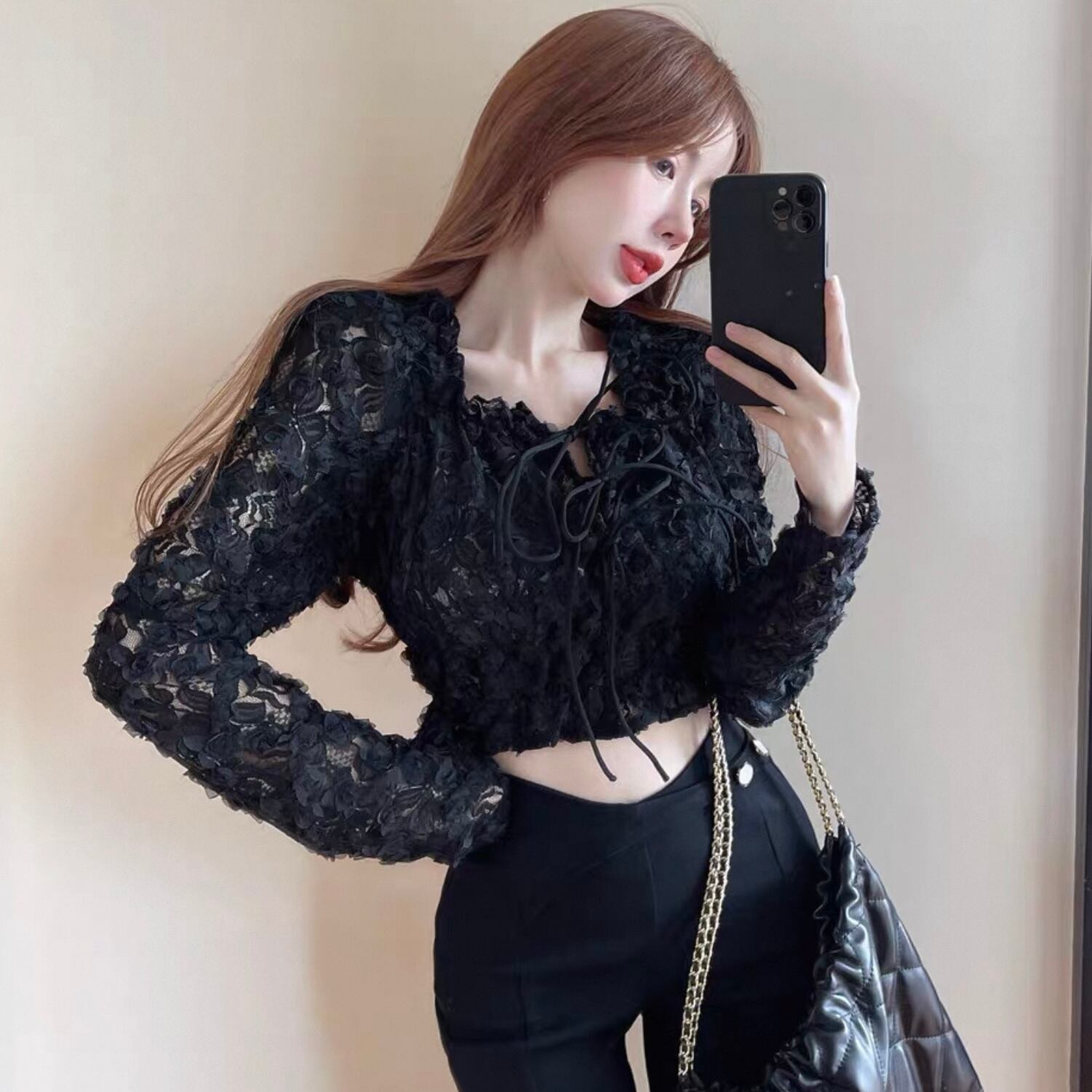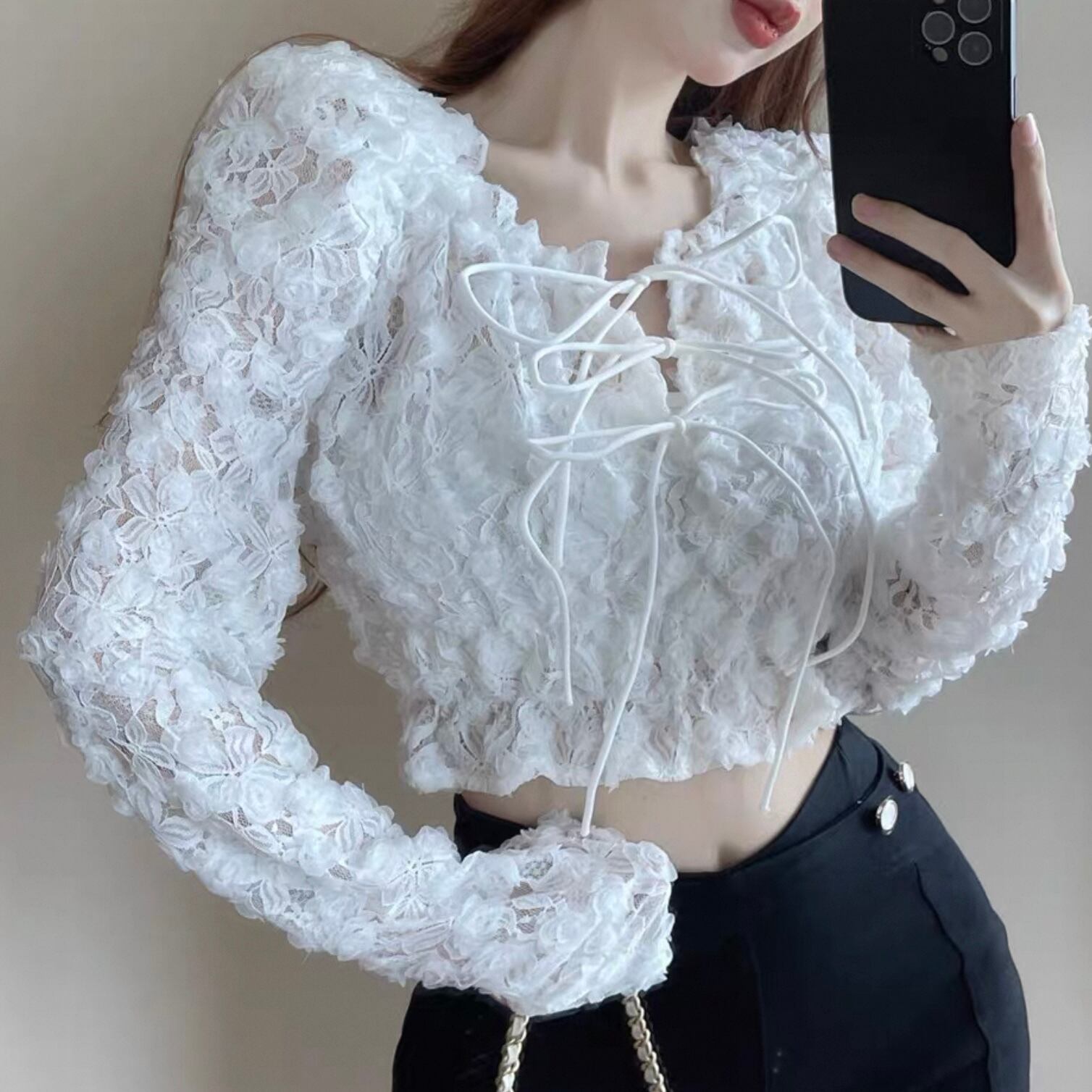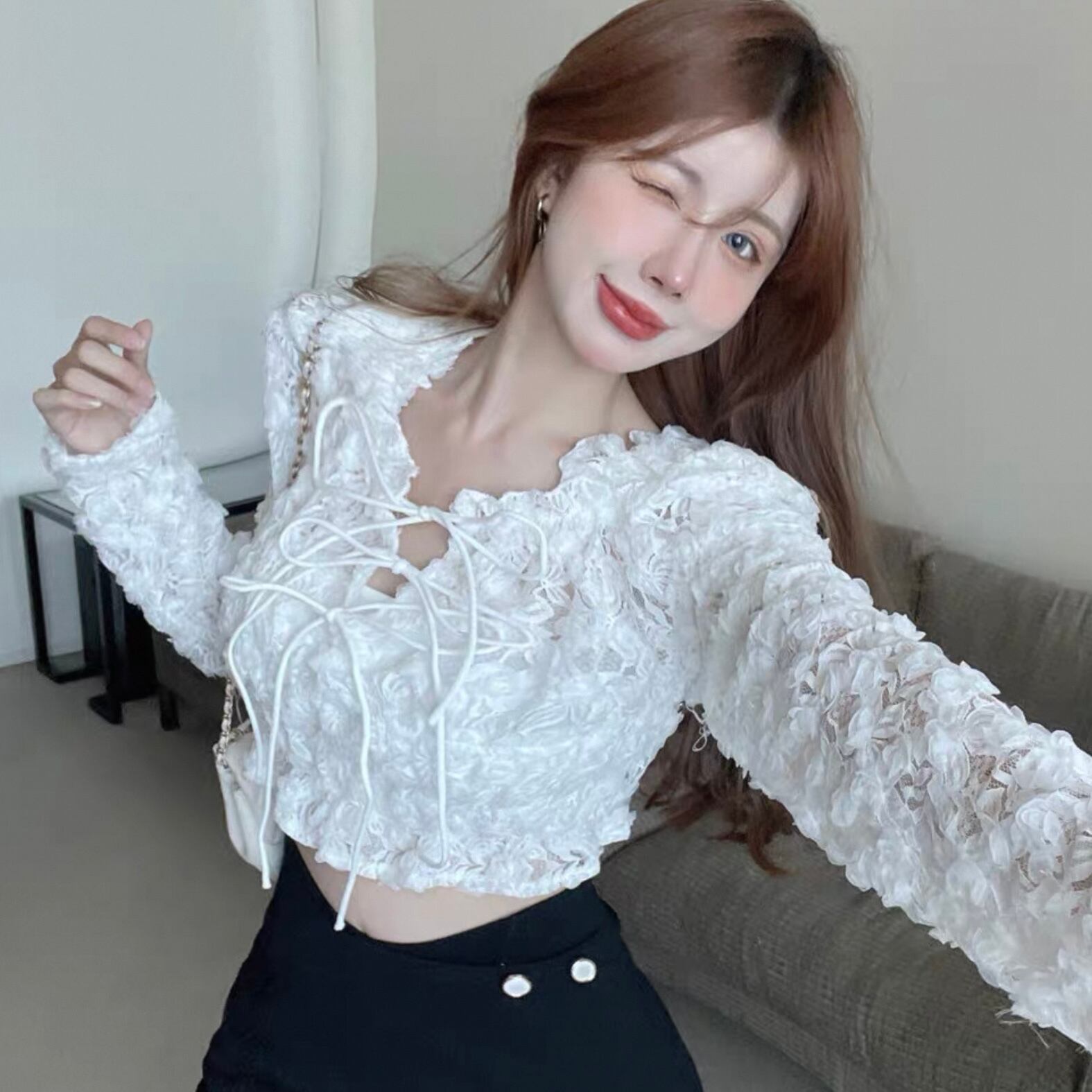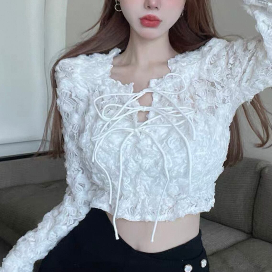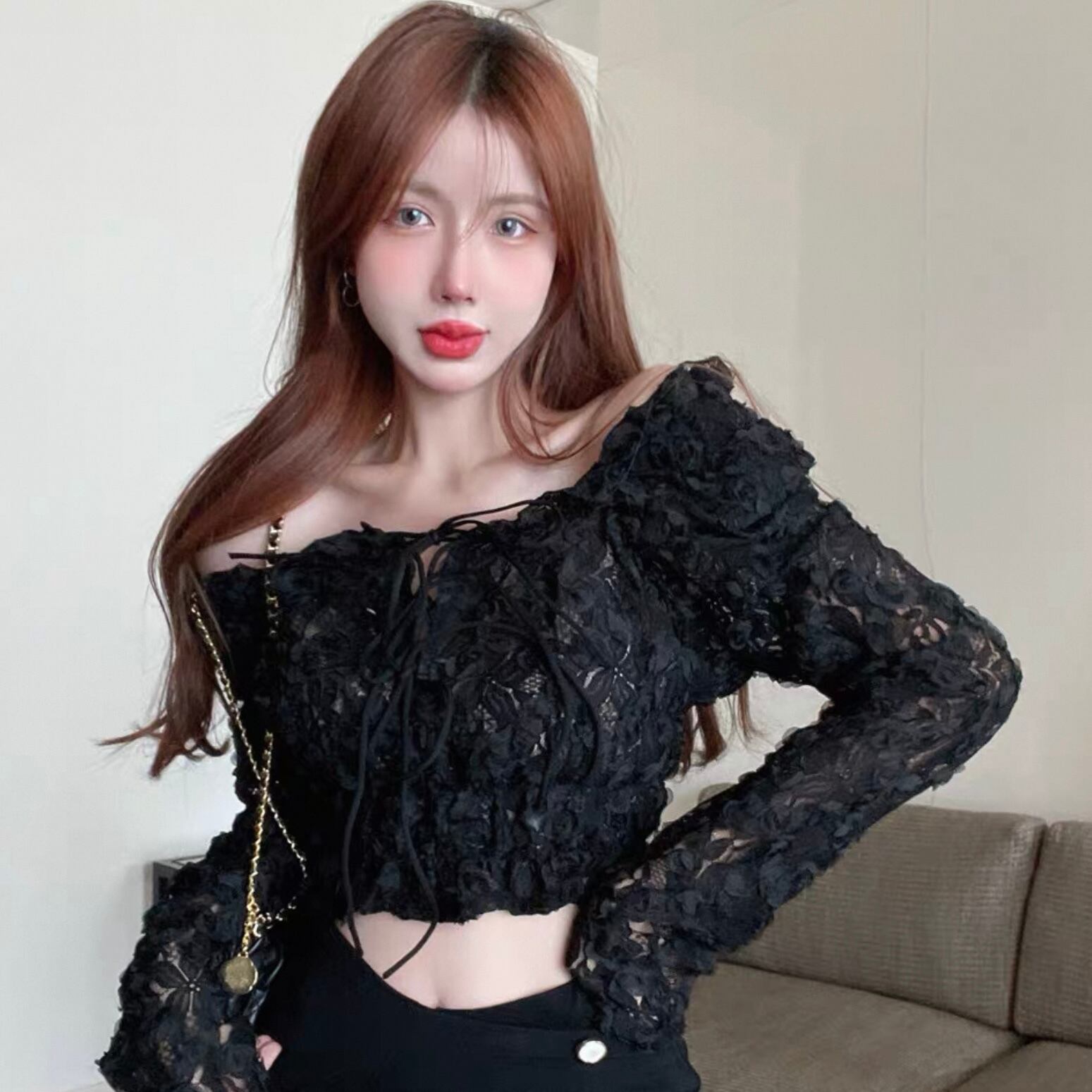 【tops】オフショルダー長袖シースルートップス2色 KQ0329
