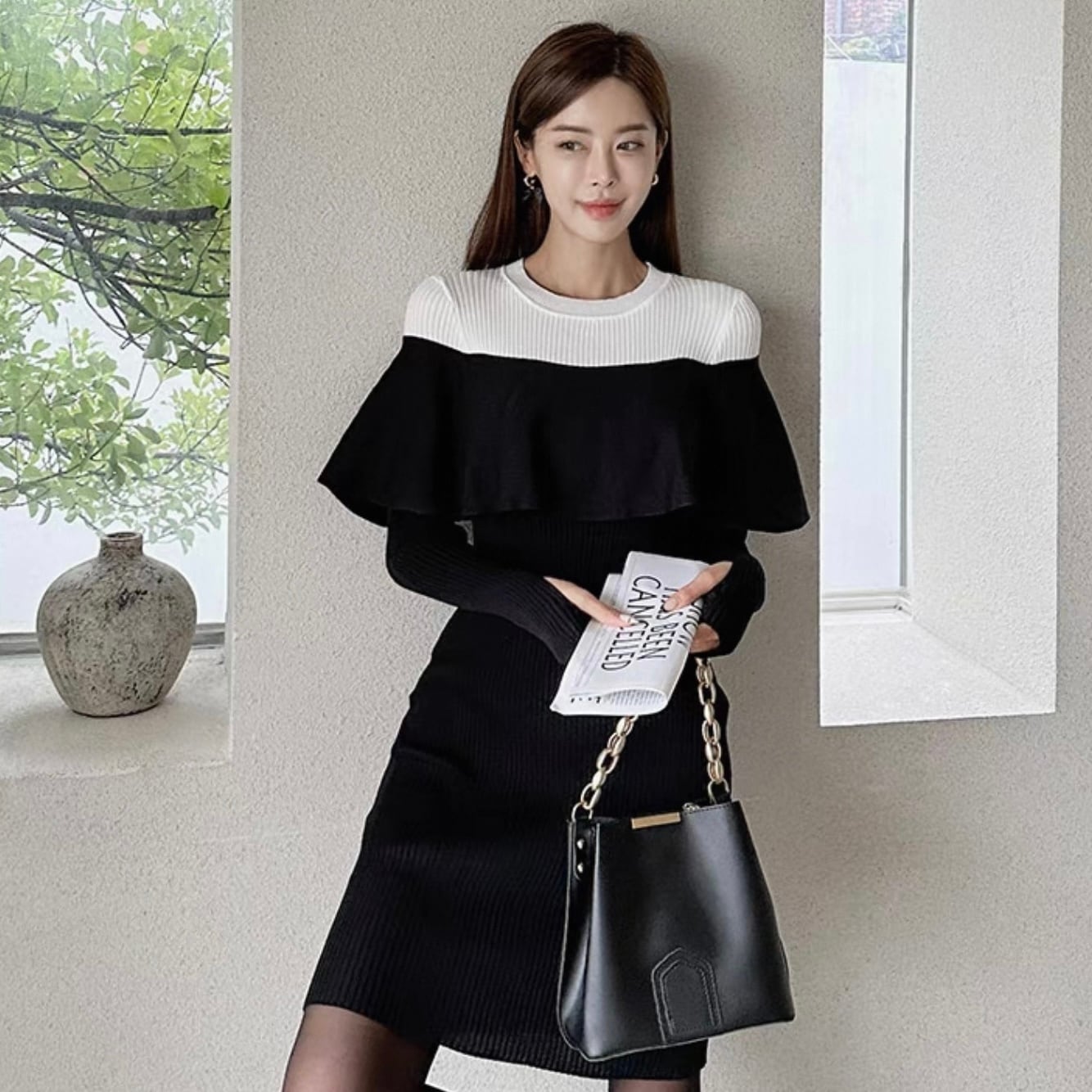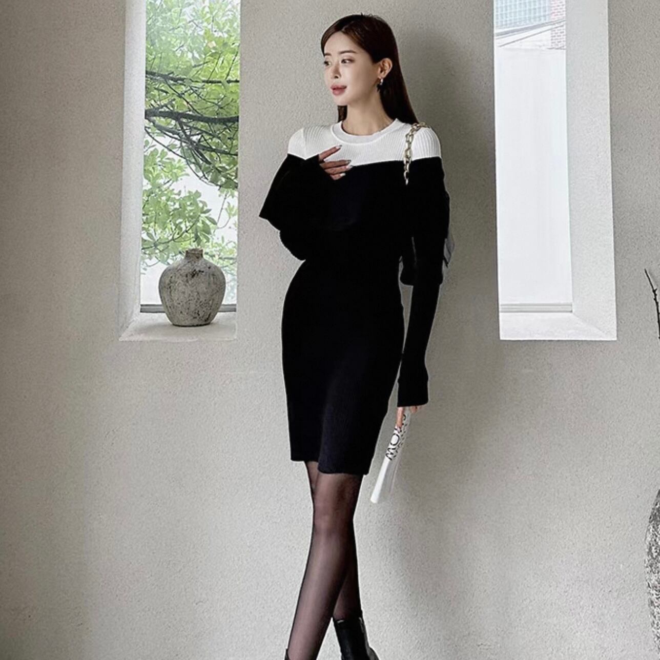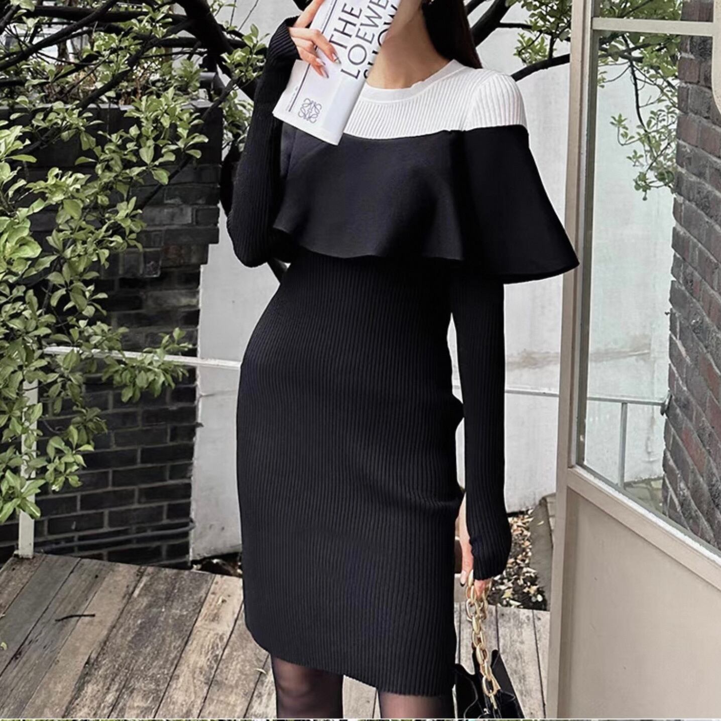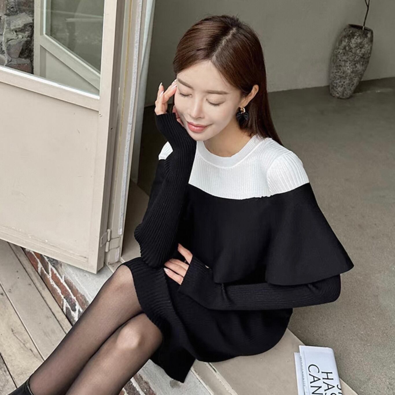 【dress】バイカラーニットペプラム長袖ワンピース KQ0330