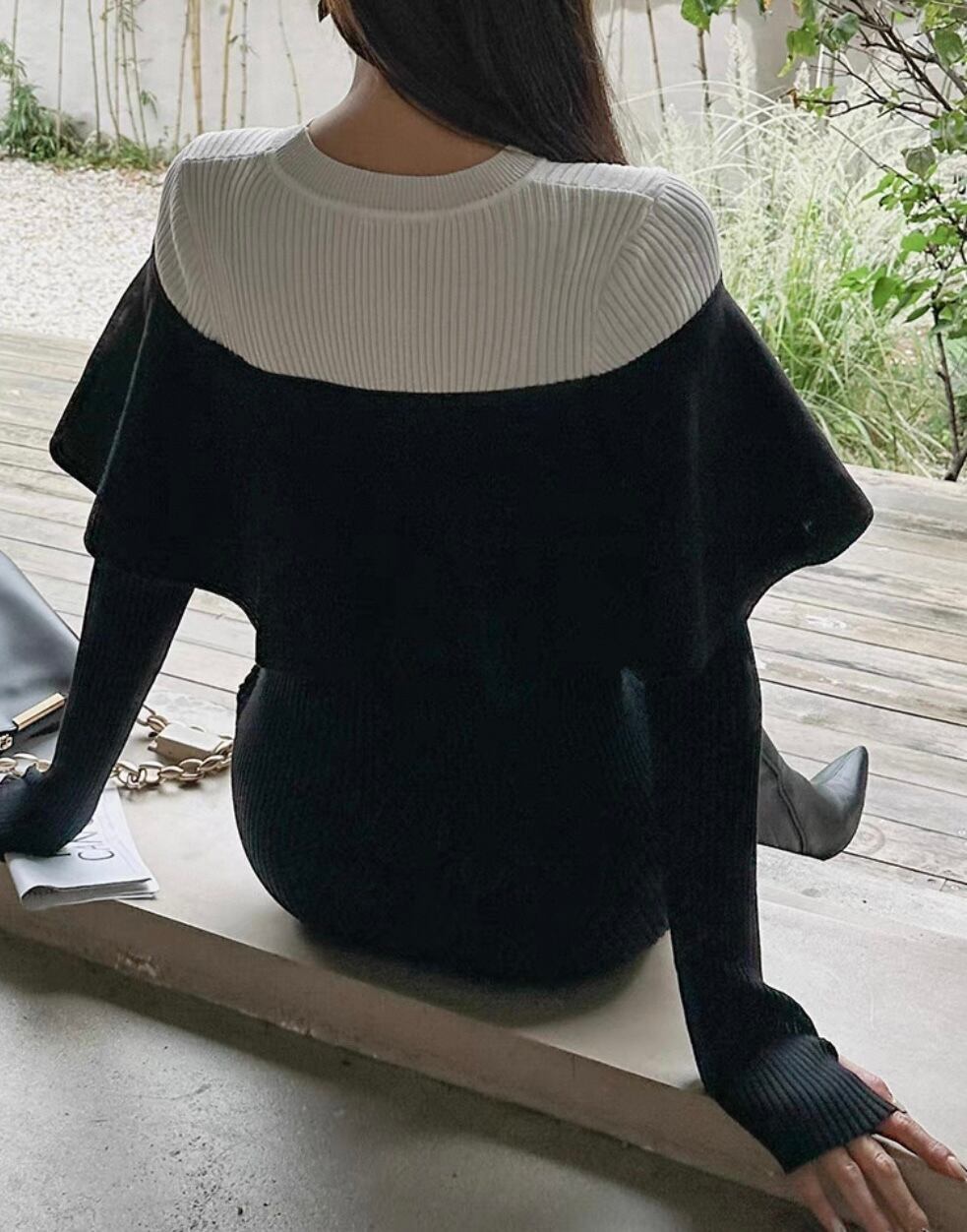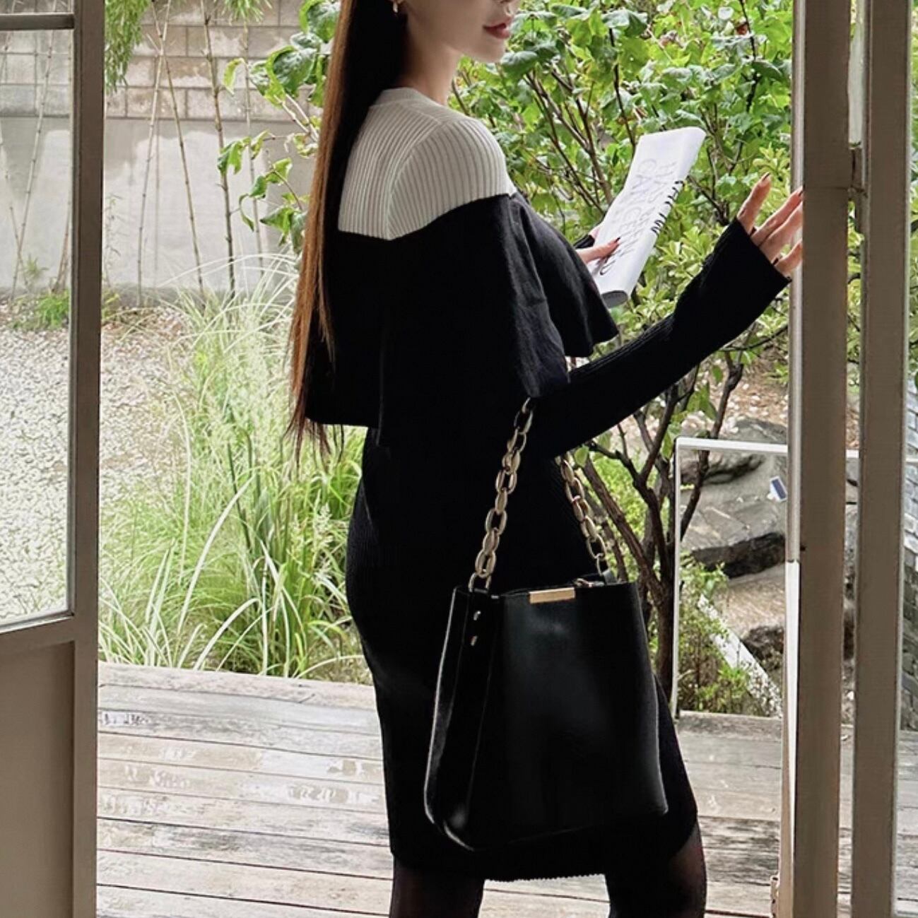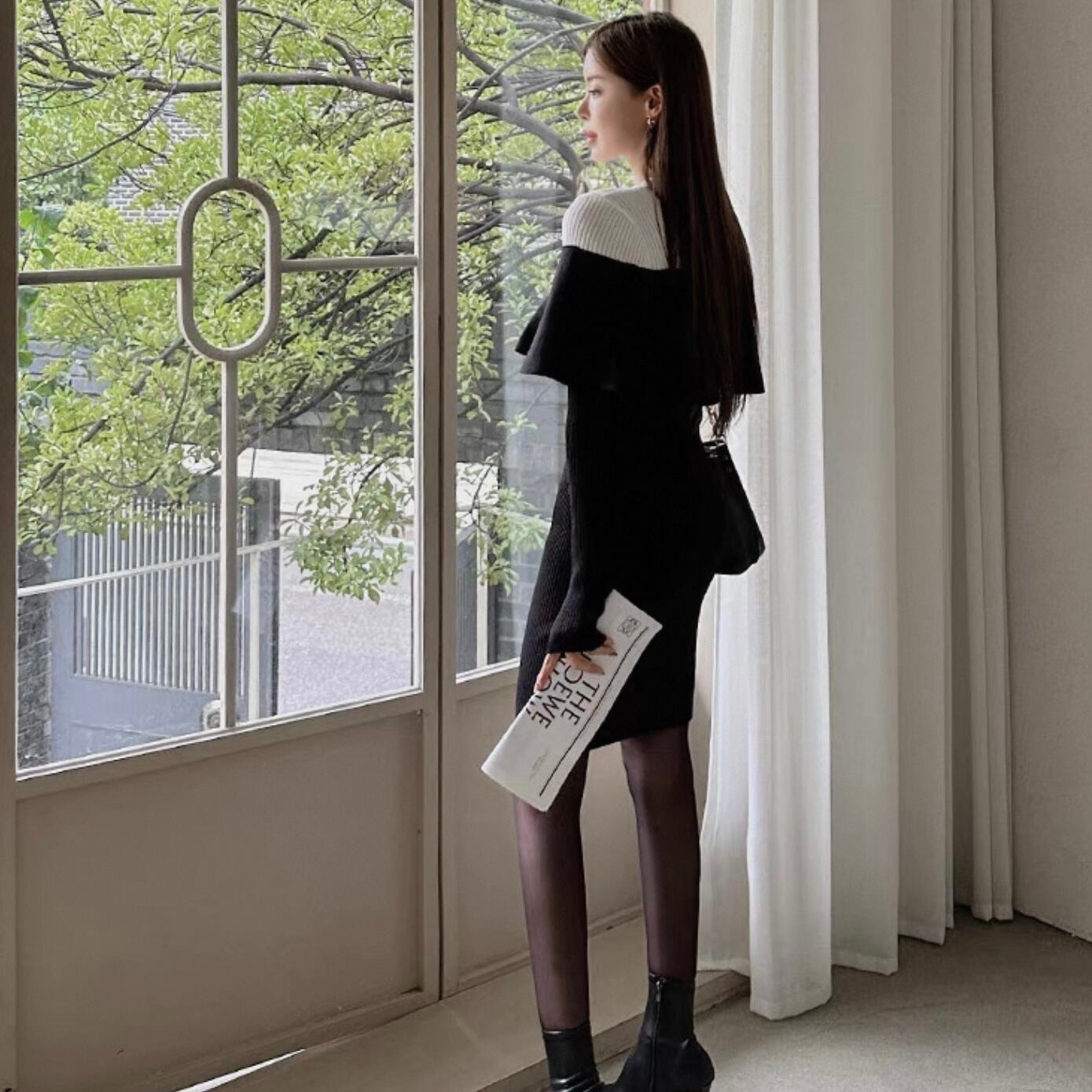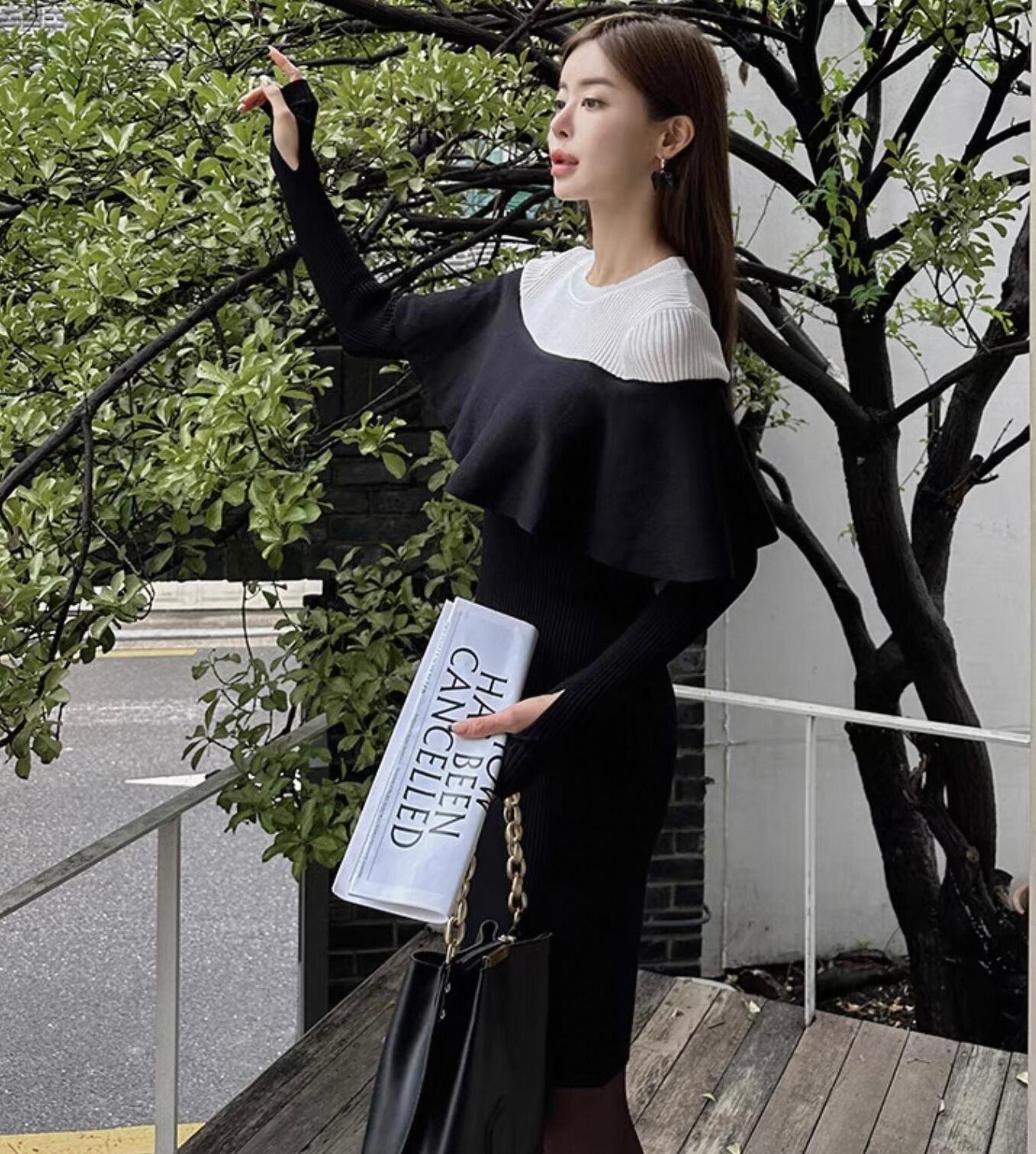 【dress】バイカラーニットペプラム長袖ワンピース KQ0330