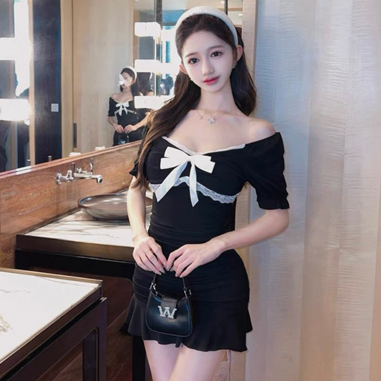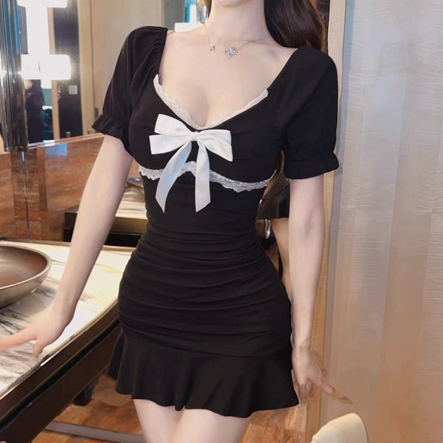 【dress】リボンレースフリルミニマーメイドワンピース KQ0332