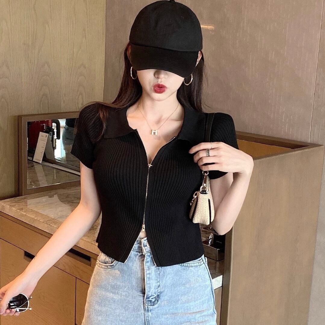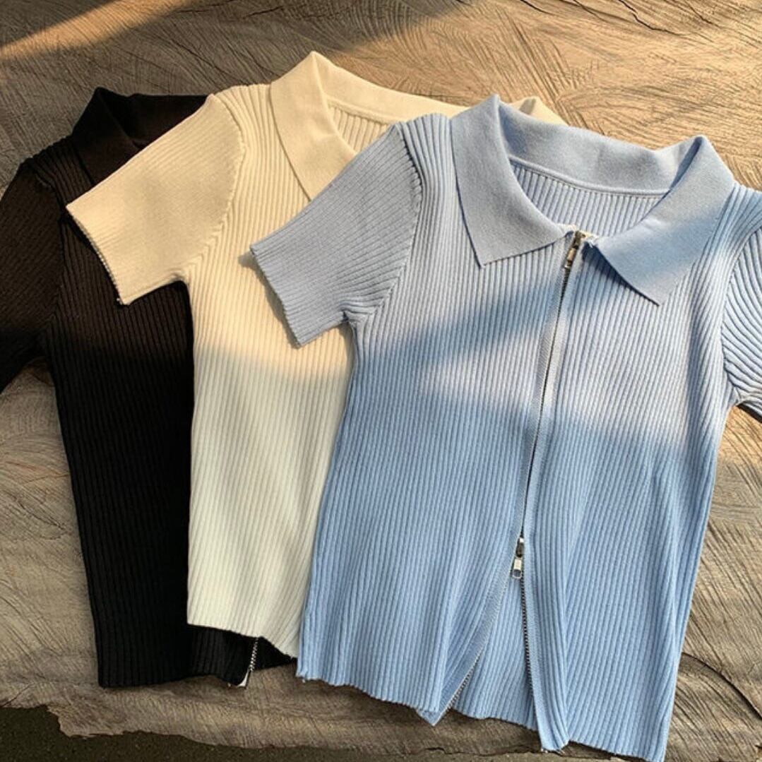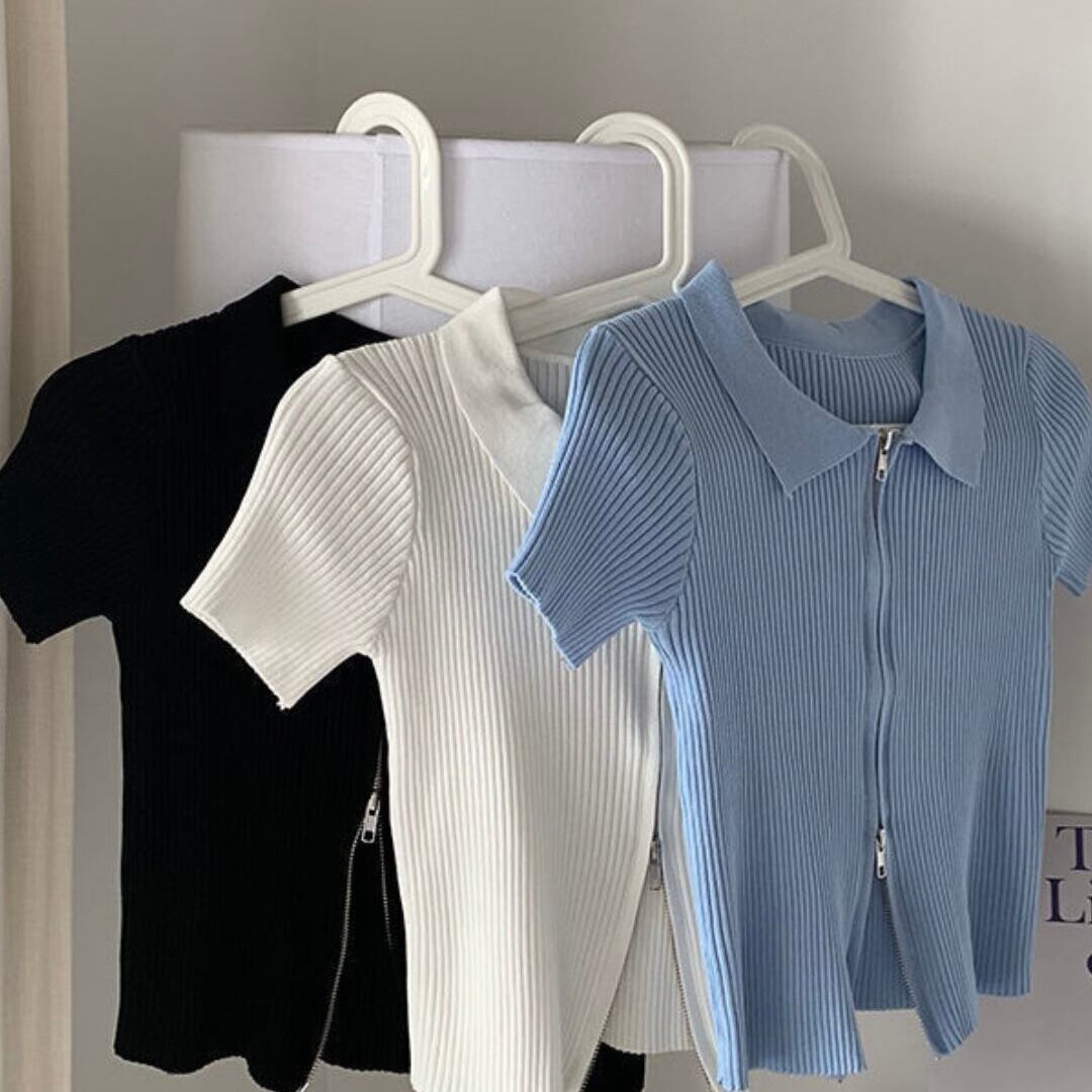 【tops】胸元チャック半袖リブニットトップス3色 KQ0347