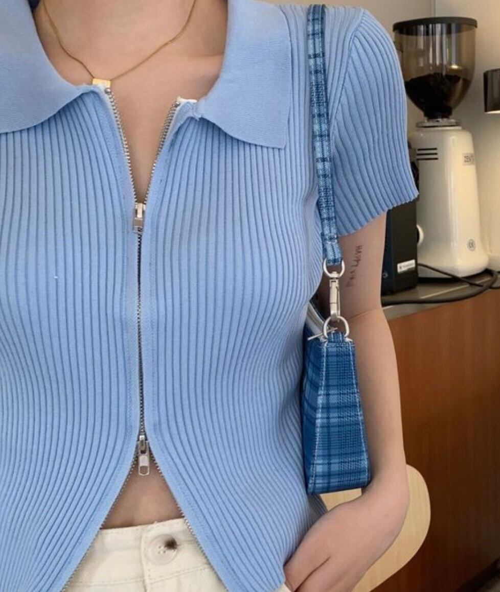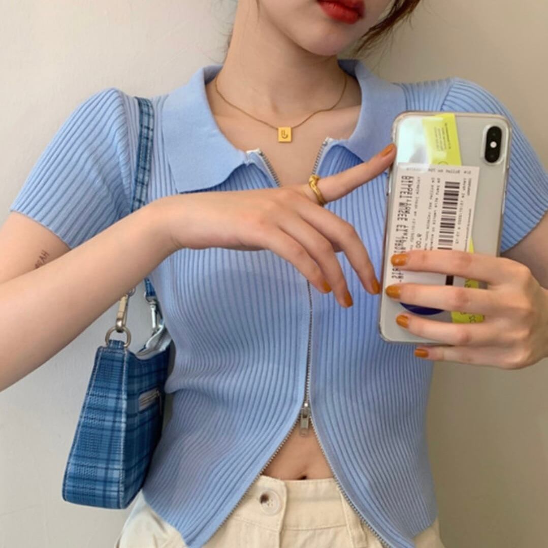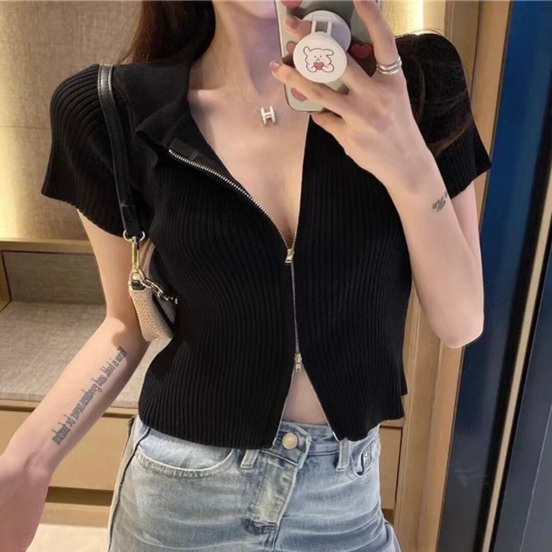 【tops】胸元チャック半袖リブニットトップス3色 KQ0347